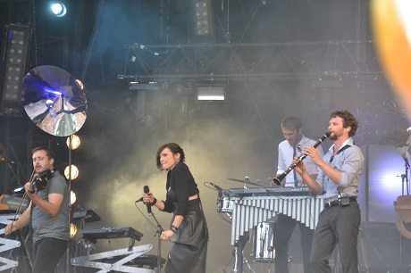 Après ces deux premiers, nous avons pu assister au concert endiablé de Caravan Palace. Ce groupe français d’electroswing a enflammé la scène Kerouac, avec sa musique très dansante, reposant sur une hybridation de puissantes basses électroniques, de musique jazzy, et de musique folklorique gitane. La chanteuse, très impliquée, n’a pas hésité à solliciter plusieurs fois le public, créant une ambiance résolument festive. Avec ses rythmes funk, voire hip-hop, Caravan Palace a effectivement très vite conquis la foule. Seul bémol : la grande similarité entre les différents morceaux.