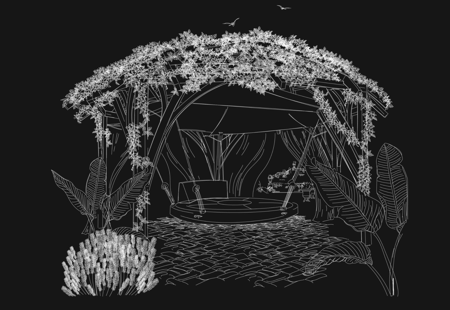 - Croquis de l’ombrière Voltige (vue de la structure réciproque et végétalisation) — Crédit : Sinallagma / Voltige