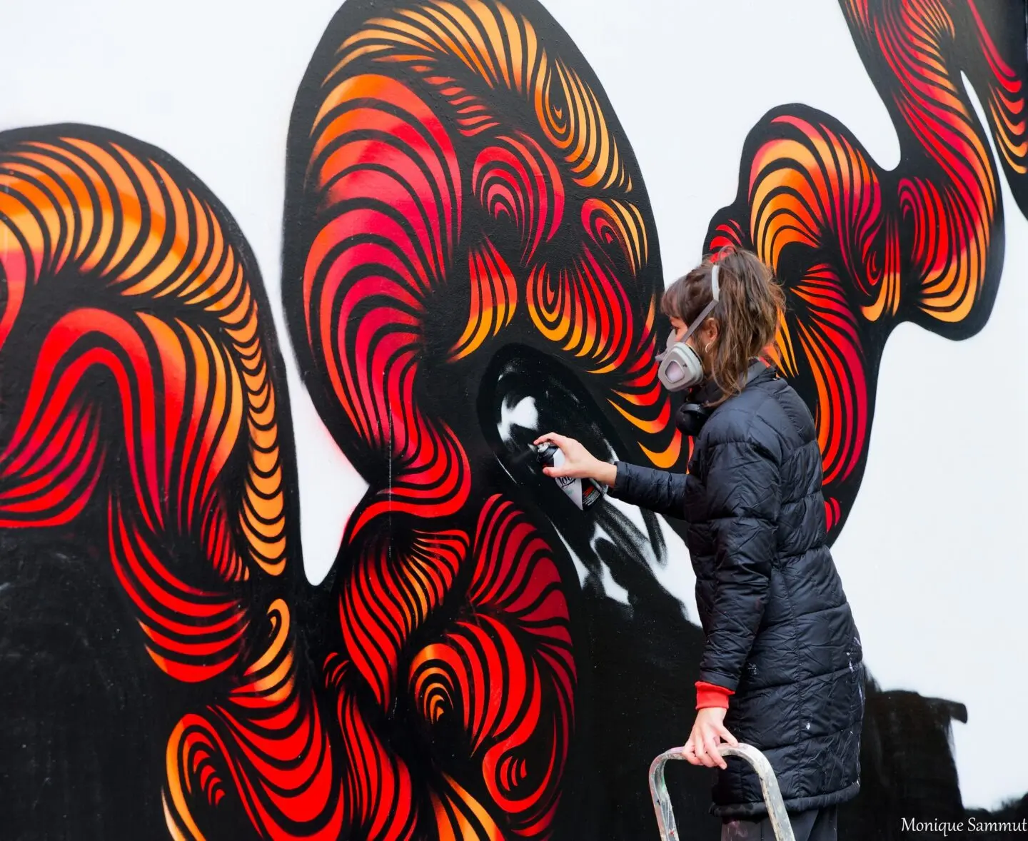 Là où les sentiments humains peuvent se vivre viscéralement, les formes linéaires et enroulées de la street-artiste traduisent le tourbillon intérieur que l’on ressent parfois et qui peut nous submerger. Dans un ballet de lignes, elle crée une poésie visuelle organique. « L’art est pour moi un levier pour gérer nos excès d’émotions ou extérioriser quand on a du mal à les exprimer. »