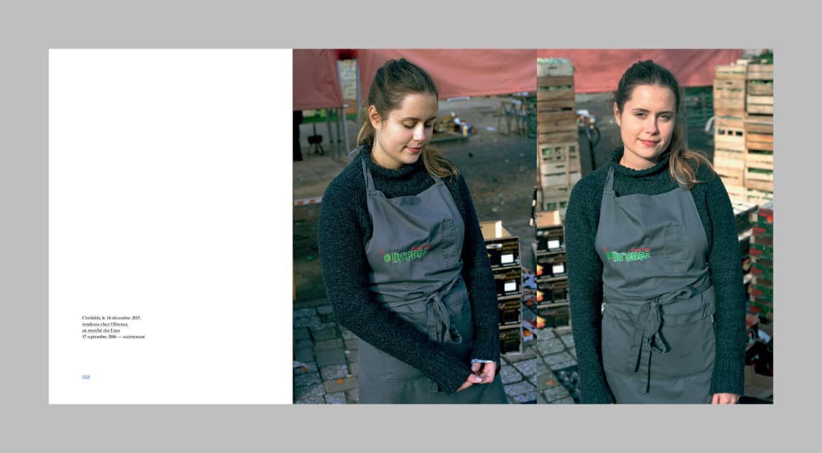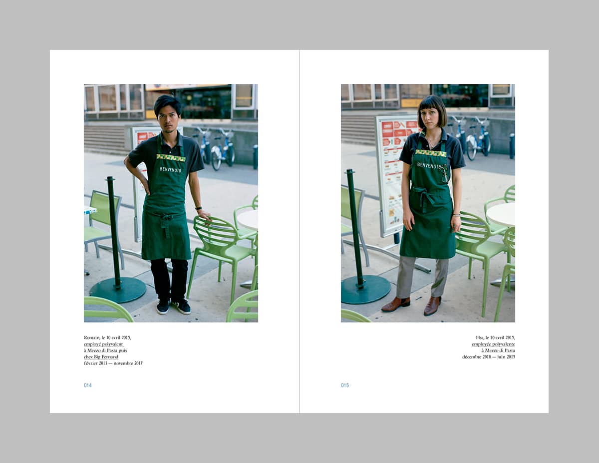 Yves Drillet – J’aime bien la photo de la fille en couverture, en portrait américain, où l’on voit mieux son plateau. Ainsi que la photo de fin, c’est aussi une serveuse, elle a une belle chemise blanche. Le parallèle est intéressant entre ce métier ancien, qui a dévié sur un métier précaire et contemporain. Les images sont simples. Il n’y a pas d’uniforme, il y a seulement un dress code et un accessoire.