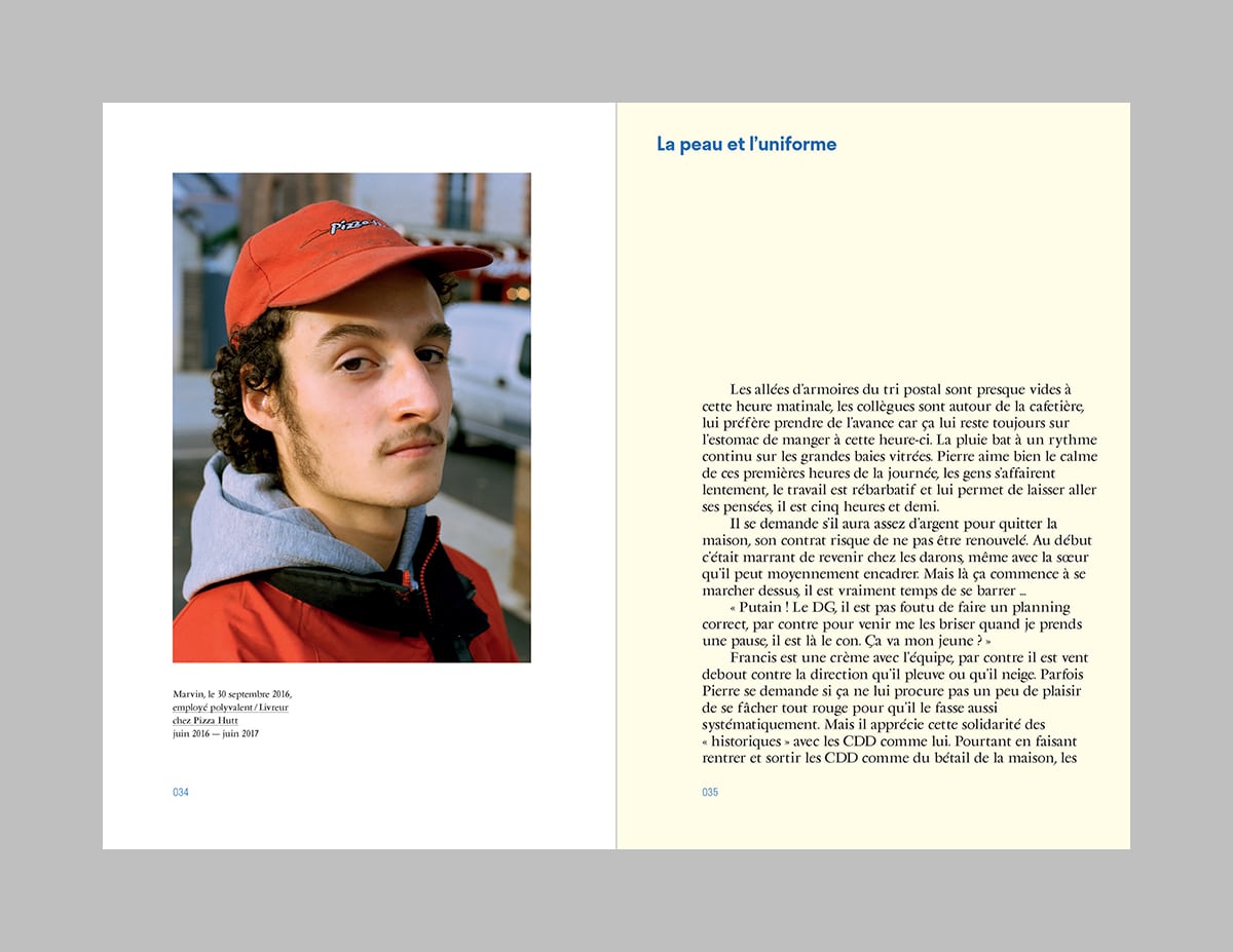 En plus, l’ajout du texte fonctionne bien au travers de ce format : La peau et l’uniforme et les photographies sont sur un pied d’égalité : on regarde les photos en premier lieu, puis on lit le texte, puis on replonge dans les photos. Cela permet d’avoir un regard différent. J’ai écrit La peau et l’uniforme après la prise de vue des portraits. La documentation m’apparaissait nécessaire pour soutenir les photos et mieux comprendre les enjeux de mon projet. Donc j’ai recontacté toutes les personnes que j’avais photographiées, et fait des entretiens avec tous ceux qui ont bien voulu.