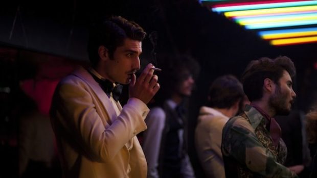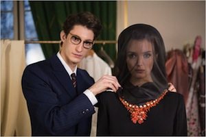 Pour résoudre de telles problématiques, la qualité de la représentation s’avère capitale. Là aussi, il faut rendre hommage à Bertrand Bonello. Non seulement le cinéaste joue habilement sur la colorimétrie de ses images (le sombre entourant Pierre Berger est particulièrement efficace), mais il se permet des choix formels d’une rare puissance. Après le split-screen, deux éléments particulièrement excitants donnent le ton du métrage. Il y a, tout d’abord, cette arrivée en contre-plongée de Betty Cadroux signifiant toute l’admiration d’Yves Saint Laurent pour la Femme. Plus que le sens, Bonello se pose définitivement, après L’Apollonide, comme l’un des artistes qui sait le mieux filmer et rendre hommage à la gent féminine. Le réalisateur se ferait-il le double cinématographique d’Yves Saint Laurent ? La volonté, à défaut d’être palpable, est en tout cas respectable. Il y a, ensuite, cette rencontre entre le couturier et son amant trouble et torride Jacques de Basher. Le jeu entre ces personnages, d’une longueur inhabituelle, en aller/retour via le travelling latéral, permet de mettre en rapport directement les deux hommes. L’accroche, réciproque, est immédiatement perceptible. En ne brisant jamais le lien par le montage, le réalisateur souhaite également montrer la solidité de leur relation. Avec ses propositions fortes cernant immédiatement les thématiques du personnage, Saint Laurent apparaît donc être un véritable film de cinéma où le biopic n’est plus une finalité en soi.