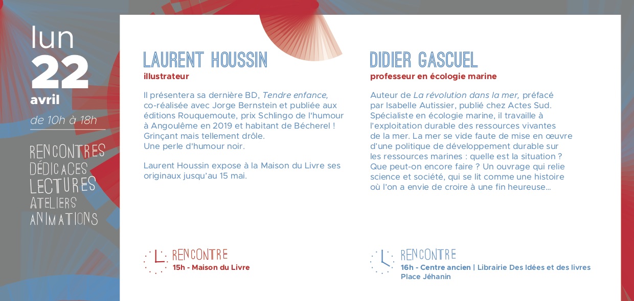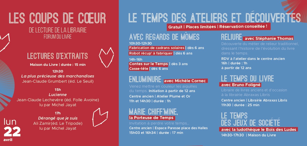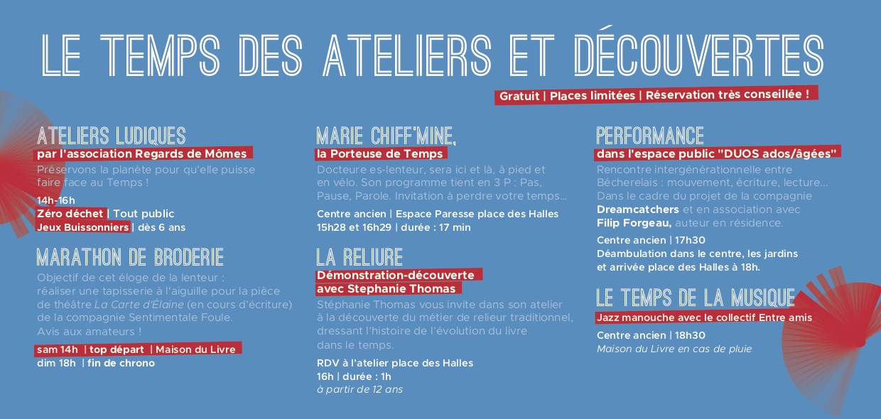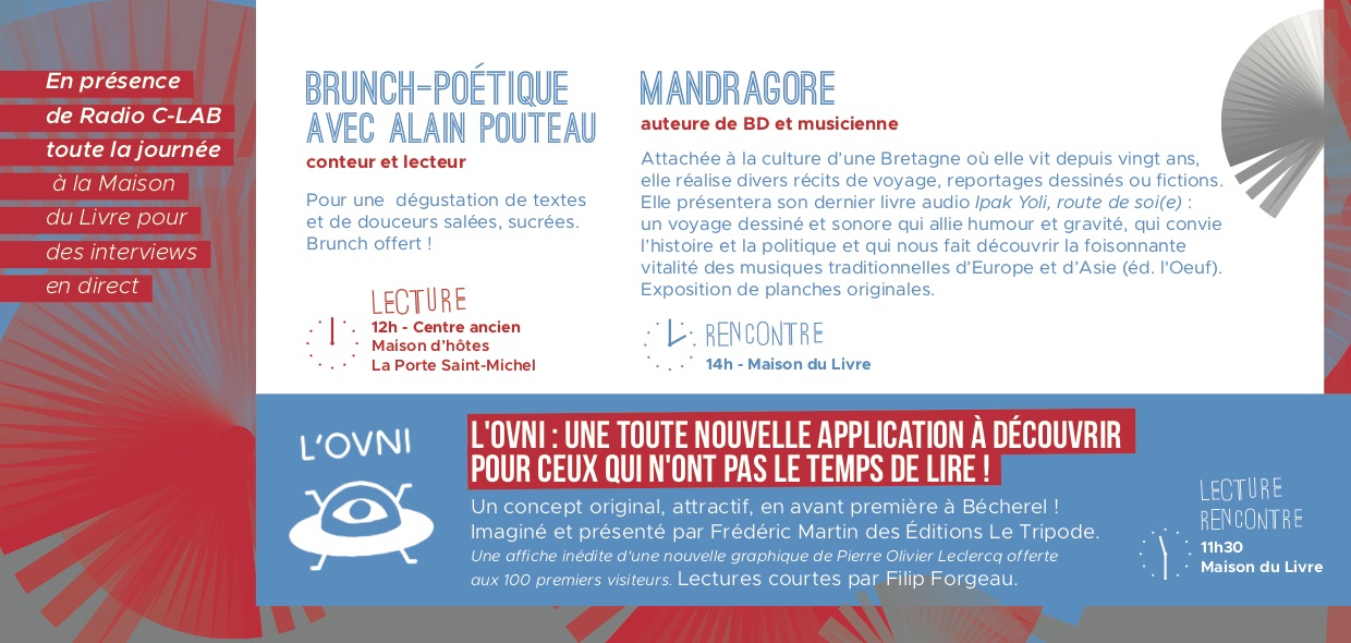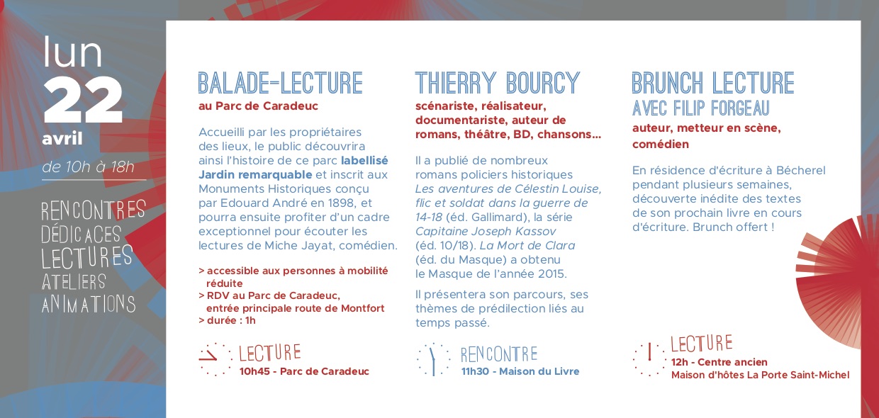 La 31e édition de la Fête du livre se déroule du samedi 21 au lundi 23 avril 2019 à Bécherel Cité du livre. Son thème : le temps. À travers une programmation variée (conférences, rencontres d’auteurs, expositions, marché du livre, ateliers, spectacles, lectures, projections cinématographiques, et de nombreuses surprises…), le public est invité gratuitement à explorer différents versants du livre et de la littérature. Ô Bécherel, suspends le temps ! Le temps de lire.