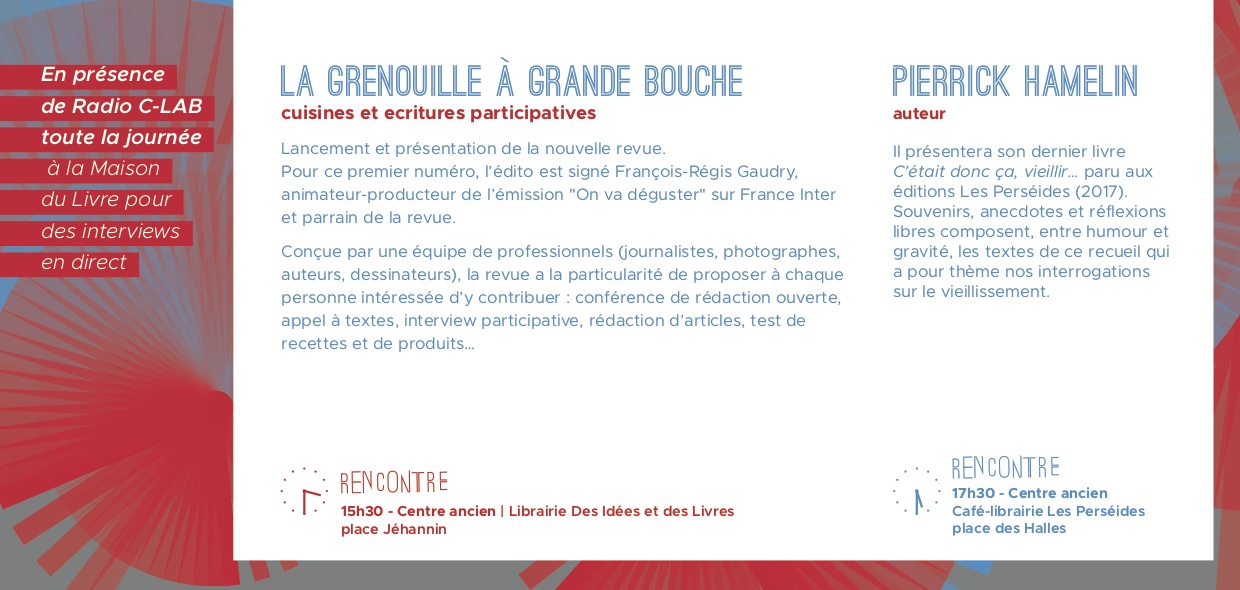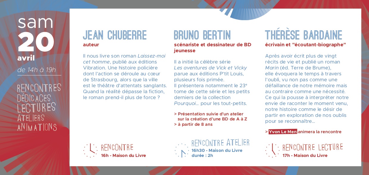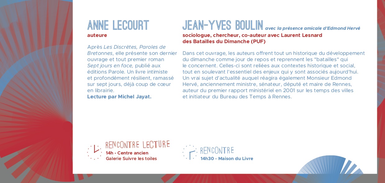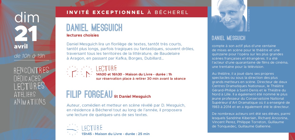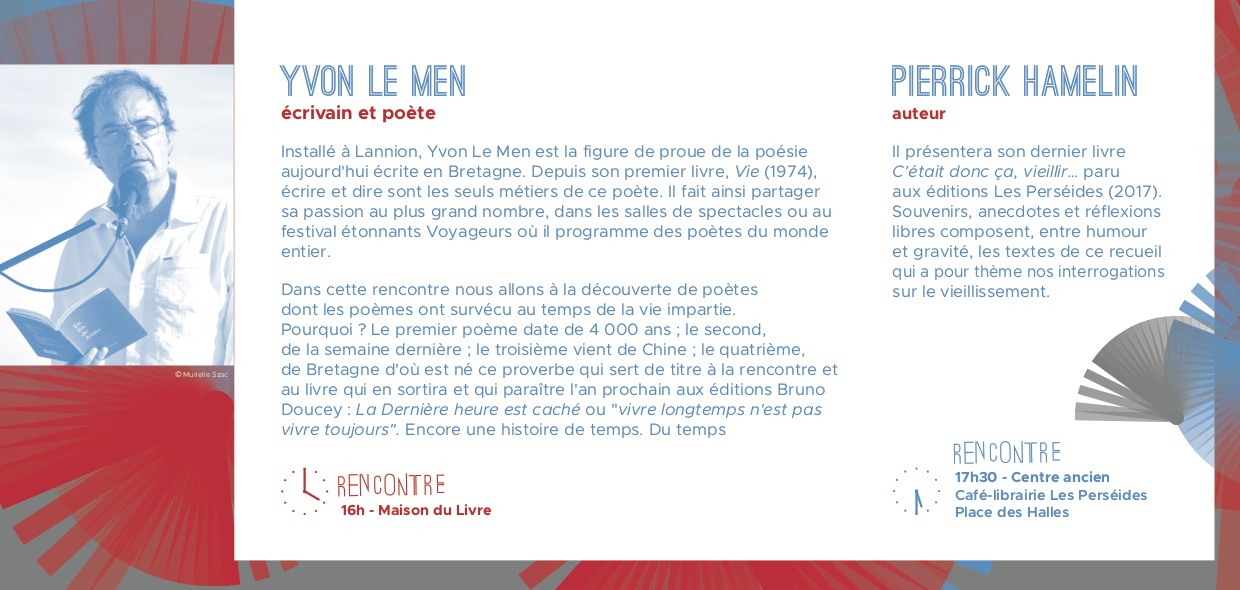 La 31e édition de la Fête du livre se déroule du samedi 21 au lundi 23 avril 2019 à Bécherel Cité du livre. Son thème : le temps. À travers une programmation variée (conférences, rencontres d’auteurs, expositions, marché du livre, ateliers, spectacles, lectures, projections cinématographiques, et de nombreuses surprises…), le public est invité gratuitement à explorer différents versants du livre et de la littérature. Ô Bécherel, suspends le temps ! Le temps de lire.