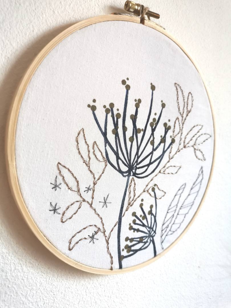 Son intérêt pour les imprimés a fait germer un style doux et très actuel, des compositions brodées de multiples techniques : le dessin à la main (feutre, crayon ou Posca), aquarelle, linogravure et broderie. « J’avais déjà beaucoup d’univers et de graphismes en tête. J’aime mêler la finesse du trait à la modernité de la géométrie et des formes abstraites. J’aime ce qui touche à l’imaginaire abstrait. » Son affection de la ligne, des formes et des textures matérialise sur papier des créations végétales à l’univers poétique. La douceur de l’aquarelle répond à la délicatesse du dessin des plantes tandis que des pointes de broderie viennent nourrir et achever la création.