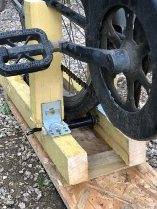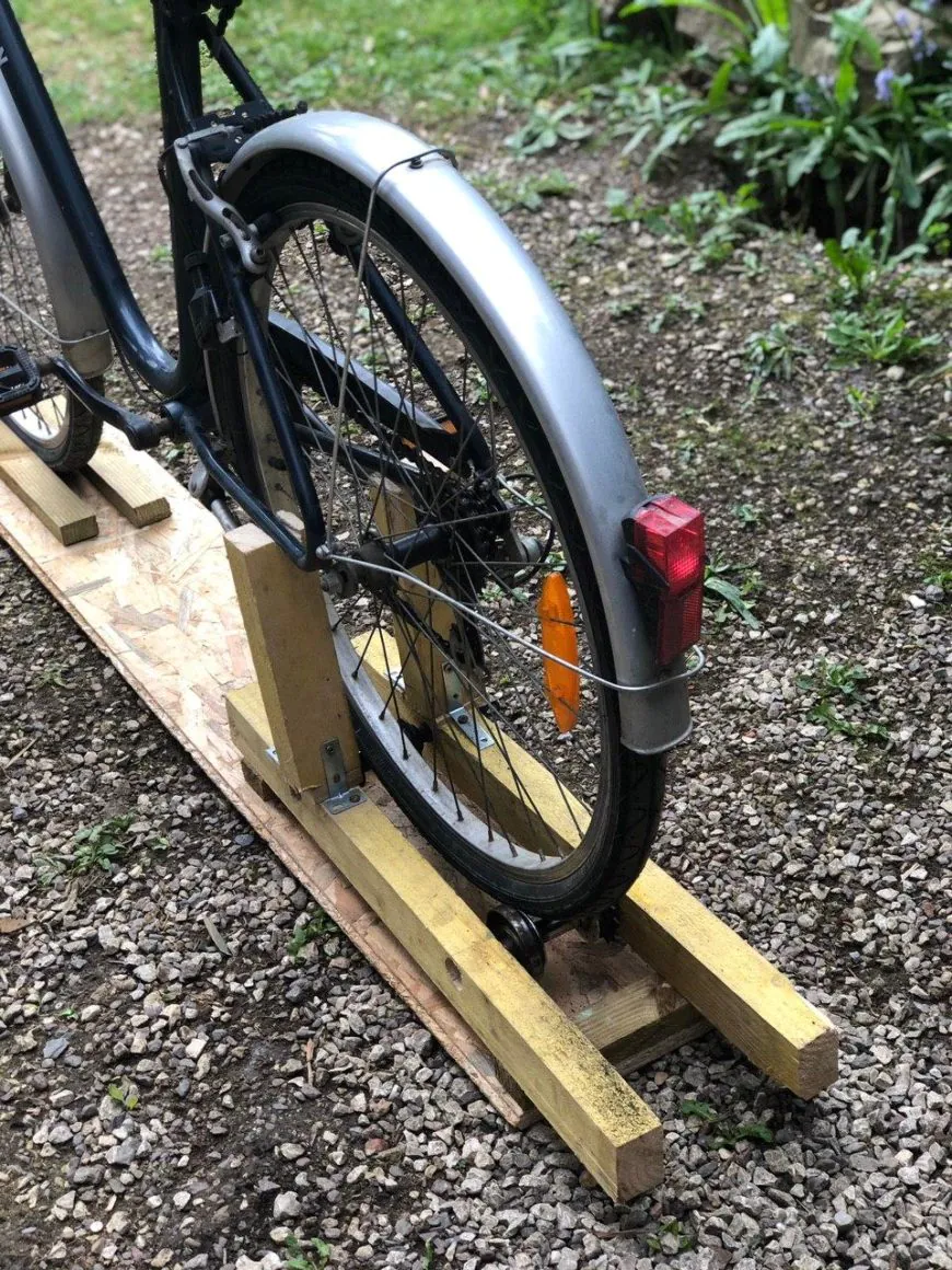 « L’idée était de ne rien acheter et de faire avec ce que l’on a à la maison. Comme nous sommes en travaux, j’ai pu récupérer plusieurs planches de bois – souligne t-il. La roue avant est bloquée par deux tasseaux de bois vissés dans un socle également en bois alors que la roue arrière est posée sur un petit plateau construit avec deux autres tasseaux.