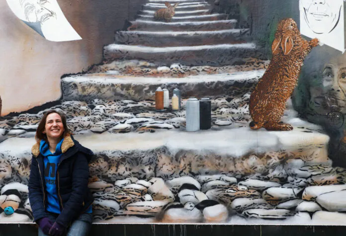 Le MUR de Rennes, lieu d’exposition en plein air 34 rue Vasselot, change au fil des mois, au fil des saisons. Chaque artiste y apporte sa touche, pose sa pierre à cet édifice du street art initié en 2019. Après Sane2, c’est au tour de l’artiste Adey, Adeline Yvetot de son nom de naissance, de s’approprier ce tableau grand format. Des lapins peignent en catimini, menacés par la lumière d’un gyrophare au loin, des visages sur les murs d’une ruelle pavée…