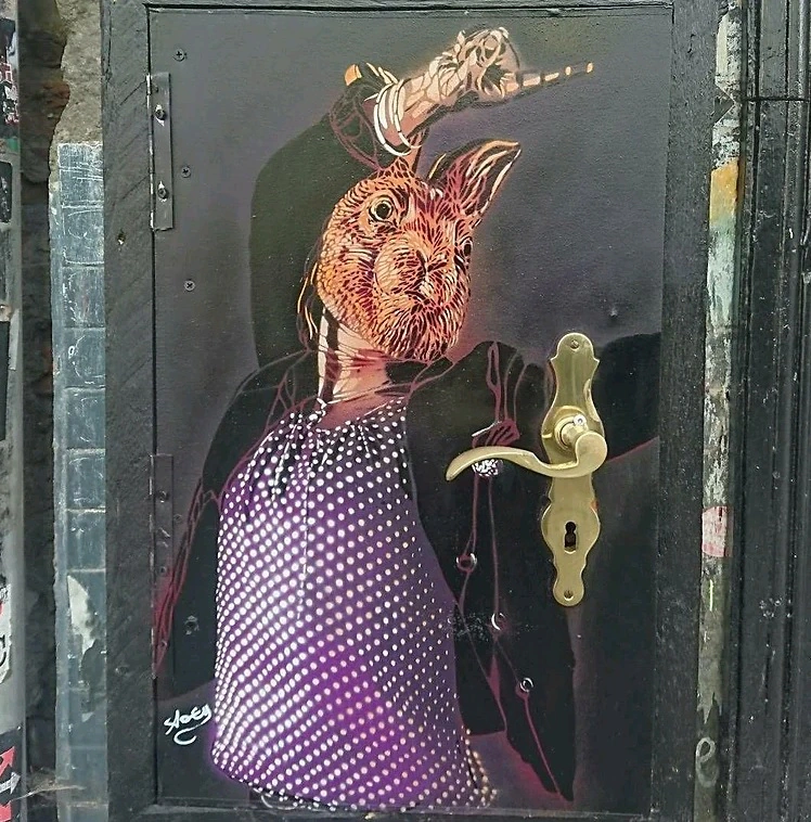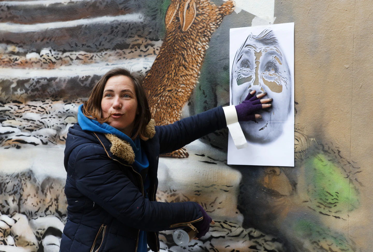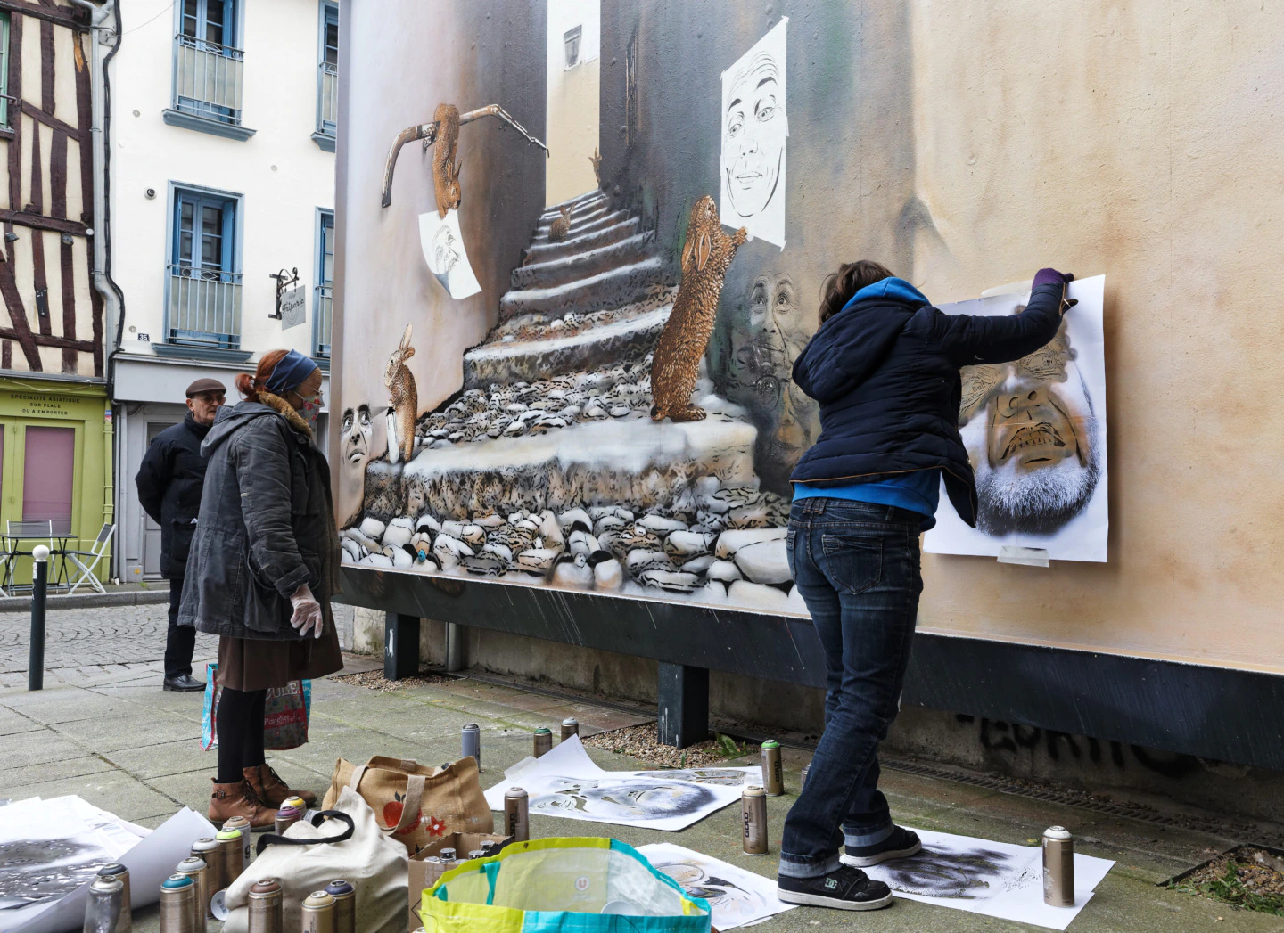 Les lapins de la pochoiriste caennaise Adeline Yvetot, aka Adey, font le MUR de Rennes jusqu’à la fin du mois de mars 2023. Spécialisée dans la technique de la double découpe polychrome, elle crée des mondes picturaux figuratifs dans lesquels ces animaux touffus aux longues oreilles l’accompagnent au fil de ses pérégrinations artistiques. À Rennes, dans une ruelle pavée, les rôles sont échangés, des lapins peignent des visages de personnes sur les murs. Des visages peuvent vous sembler familiers, savez-vous pourquoi ? Suivez Adey, elle vous montrera le chemin…