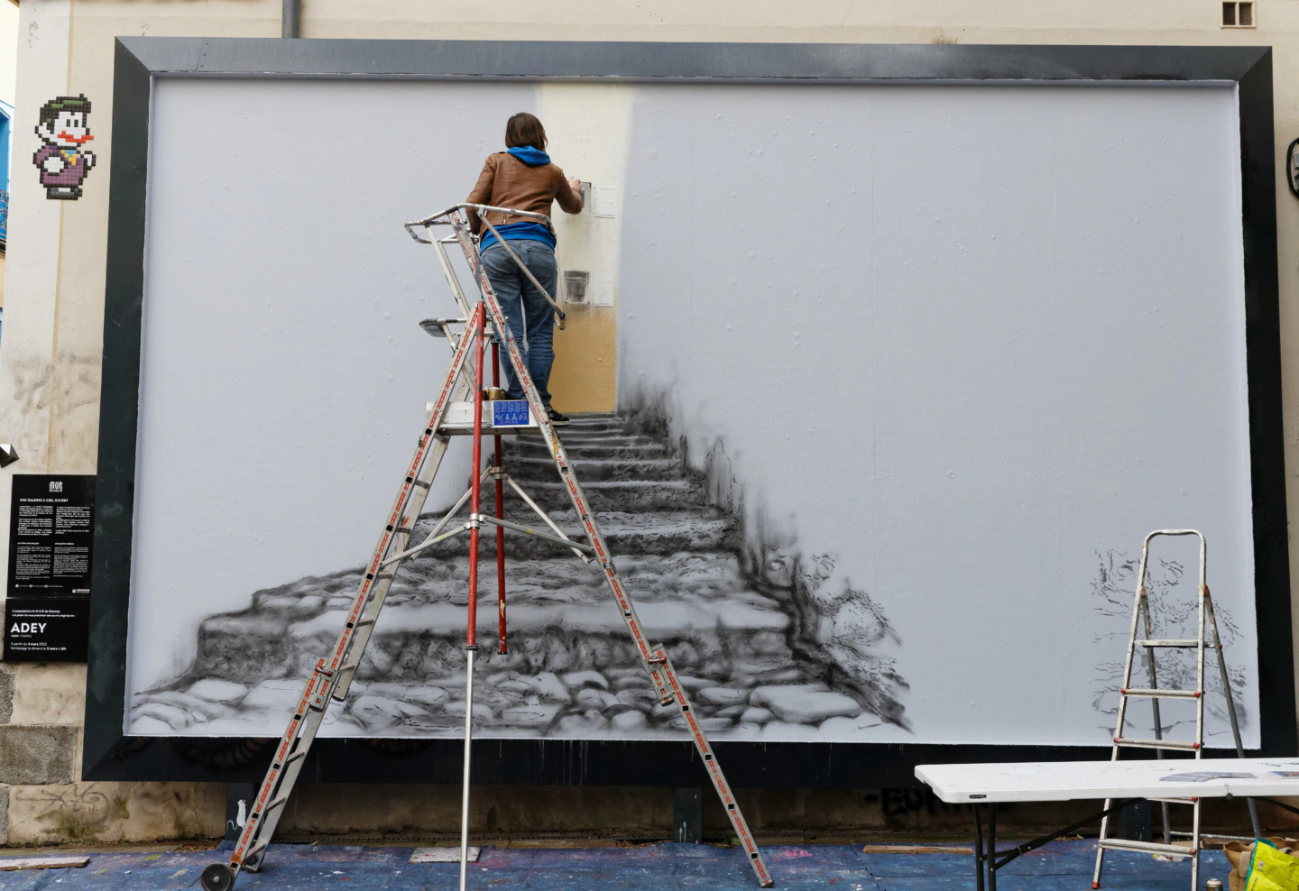 Les débuts dans le monde de l’art d’Adeline Yvetot, Adey de son nom d’artiste, se font par la porte de la peinture, du dessin et de la photographie. Après une première année à l’école des beaux-arts de Caen, elle arrête peu satisfaite de la formation. « L’école n’encourageait pas forcément la pratique de techniques classiques comme le dessin et la peinture. Plus portée sur les arts média », souligne l’artiste dont le propos résonne avec celui d’Ador interviewé en août 2022 à l’occasion de la sortie de son livre. La pochoiriste commence alors réellement à expérimenter la photographie qu’elle utilise comme modèle pour ses dessins. Son travail s’inscrit, dans un premier temps, dans le milieu associatif culturel caennais. « Il peut m’arriver de faire du photomontage ou de redessiner des zones à la main, pour transformer différents endroits si besoin, mais je dessine toujours à partir de photos. »