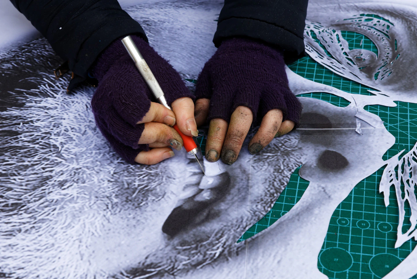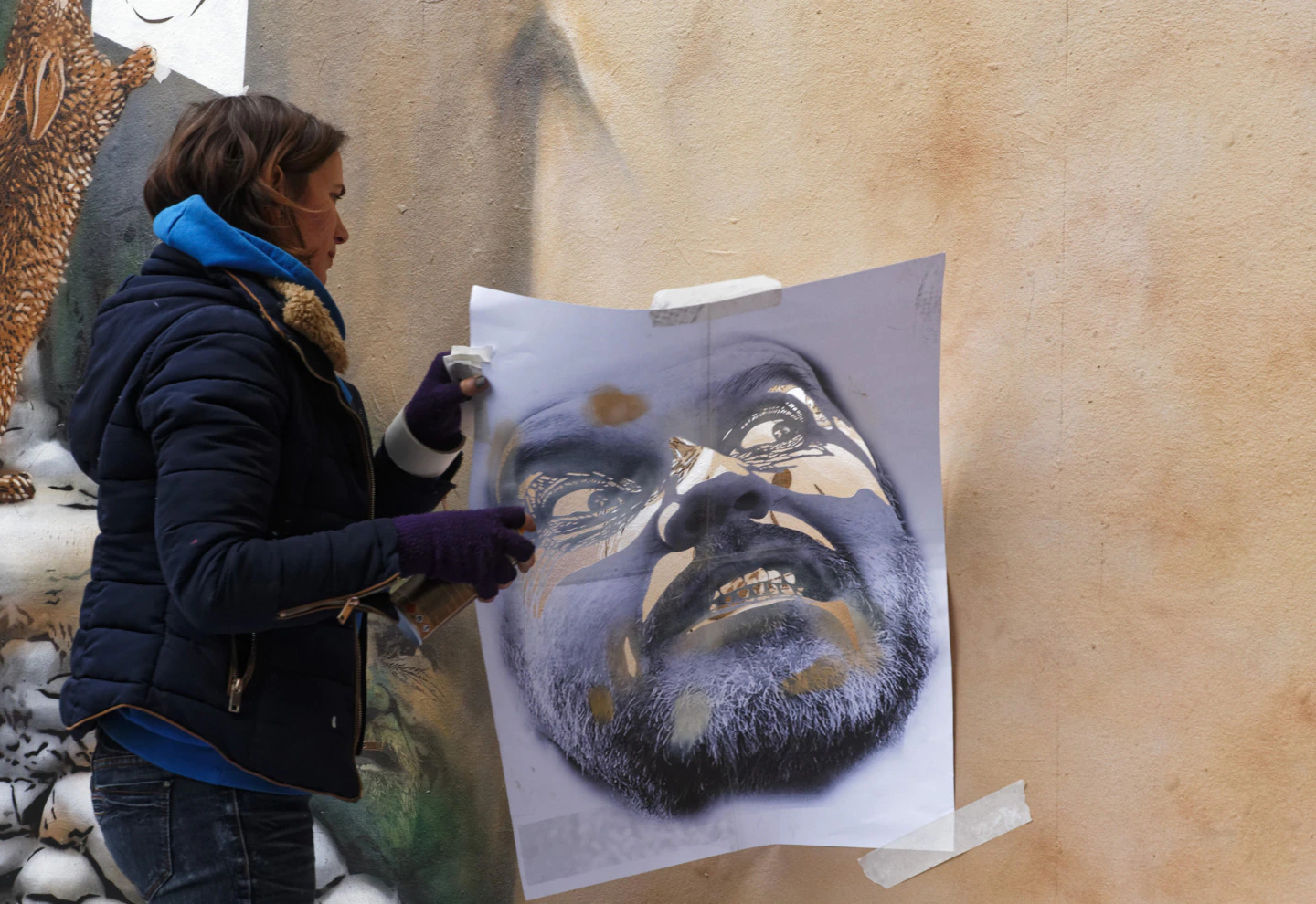 La double découpe polychrome consiste à imprimer une photo en deux exemplaires, ceux-ci permettront de traiter les ombres et les lumières. Sur le premier vont être traités les couleurs les plus foncées, les ombrages, on l’appelle le pochoir des noirs. Sur le deuxième, les couleurs les plus claires, les lumières, le pochoir des blancs. « Les deux sont complémentaires et toutes les couleurs intermédiaires sont placées à main levée. On peut avoir un résultat en noir et blanc sur fond gris, comme un résultat multicolore d’où le terme de double polychrome. On peut mettre plusieurs couleurs à main levée et avec le même pochoir, ce n’est pas un pochoir par couleur. » Le street artiste français leur transmet ce savoir-faire comme un artisan à ses apprentis avant que chacun puisse se l’approprier. « La bascule vers le pochoir s’est faite naturellement du fait que je travaillais déjà d’après des photos. »