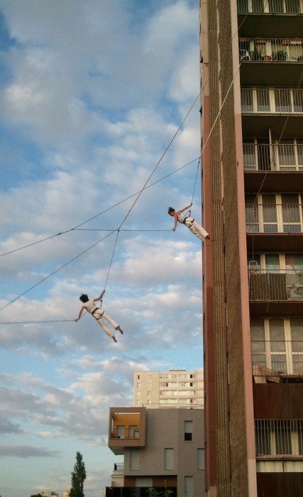 Jeudi 28, à nouveau, une avalanche de danse avec le percubus qui viendra chercher en rythme enfants et parents à la sortie des écoles du quartier (plus de précisions ici) afin d’ouvrir le bal Afro Gombo à 17h avec Fatima Leghzal et la compagnie Dounia. De 18h à 21h, le Triangle propose un enchevêtrement de danses ouvertes aux amateurs et de spectacles effrénés. A 19h, les danseurs de la compagnie Retouramont –ceux-là mêmes qui auront initié la veille les plus téméraires des Rennais à la tyrolienne – se produiront sur la façade d’un immeuble de la place de Serbie. La magie de la danse alliée aux frissons des techniques croisées du funambulisme et de l’escalade pour deux danseuses qui confrontent ensemble le poids de la chair au vide.