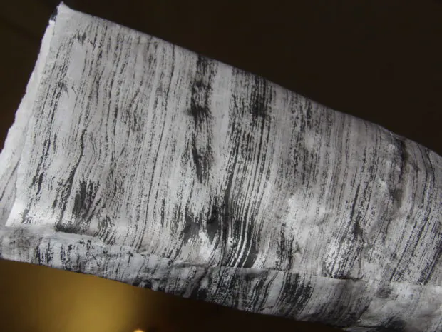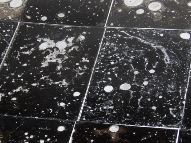 Au plafond, des branchages en papier de riz ont nécessité des heures de patience et de concentration pour rendre dans l’espace la beauté et la fragilité du trait d’encre, mille fois répété, jamais à l’identique. Au sol, un autre fragment d’œuvre composé de feuilles A4 comme imbibées de bulles d’air réchappées d’une marre de pétrole intensifie les nuances de noir et blanc. Sur un mur, le goudron disparaît dans une flaque et son reflet brouillé par des gouttes de pluie. Il aura fallu trois mois de prise de vue à l’artiste pour obtenir ce rendu vidéo si juste et si poétique, où chacun verra entre ombre et lumière le reflet de son propre imaginaire.