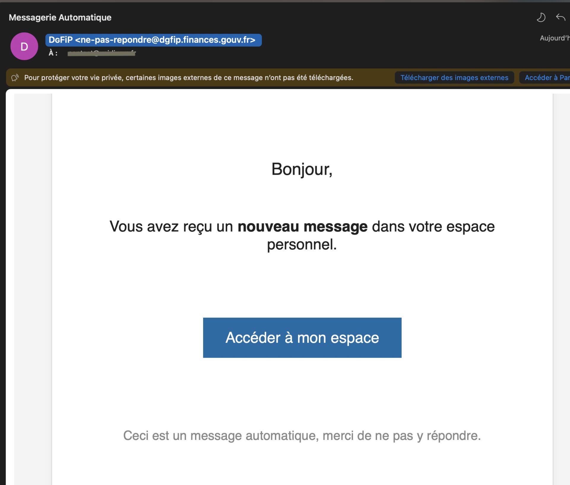 En pleine période de déclaration de revenus, une nouvelle arnaque par courriel sévit activement. Des escrocs envoient un faux mail qui utilise un mail avec le nom officiel de la Direction générale des Finances publiques ( ne-pas-repondre@dgfip.finances.gouv.fr), vous annonçant un remboursement d’impôts imminent. Le message semble crédible, l’adresse est bien celle des impôts : on vous invite à cliquer sur un lien pour consulter votre espace personnel. Attention : il s’agit d’une escroquerie !