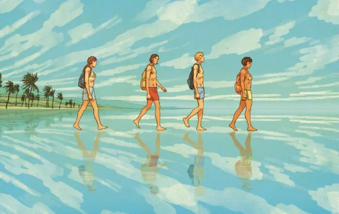 Le dessin de Nicolaï Pinheiro remplace parfaitement les mots et comble à la perfection les silences, les sous-entendus, les non-dits. Aussi pudiques et taiseuses que les caractères des deux voyageurs, les couleurs à dominante ocre, sont sourdes et emplies de la chaleur et de la modestie des lieux. Pas d’exaltation, ni d’exclamation dans ce pays traversé, loin du tourisme et des images traditionnelles. Il faudra attendre les deux dernières pages pour que le bleu éclatant du ciel et de la mer prennent le pas sur l’obscurité. Deux dernières pages et la couverture magnifique comme un trompe-l’œil ou comme une fin heureuse où chacun marche l’un derrière l’autre. Telle une cordée.