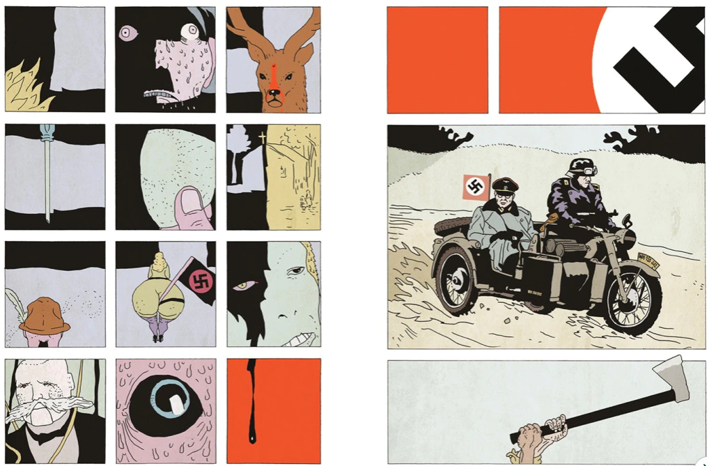On pense aux peintures expressionnistes qui déforment la réalité objective pour traduire les sentiments subjectifs. La galerie de portraits cyniques rappellent les toiles de Kirchner, Munch, ou Fritz. Les habitants du Nid vivent dans un monde parallèle et le récit, sans aucune connotation politique, ridiculise à l’extrême le nazisme et ses mythes meurtriers. Toutes et tous sont de tristes bouffons, malades de bêtise et de grossièreté, eux qui se pensaient la race élue ne sont que des aliénés perdus dans le sexe, la drogue, l’alcool.