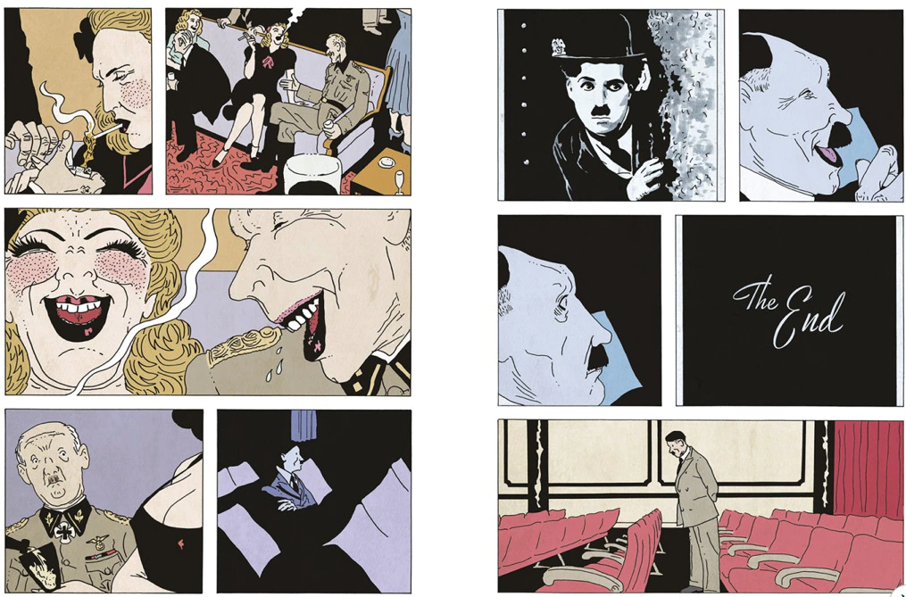 Atmosphère de fin de règne, déliquescence d’un monde onirique que rendent parfaitement les couleurs brutes et violentes de Galli, c’est une forme de malaise qui envahit le lecteur. La rigueur géométrique de six cases d’un portrait rapproché et halluciné d’un Führer angoissé devant sa glace, dont le visage se décompose pour se rapprocher d’un crâne squelettique, côtoie des dessins colorés en pleine page, surréalistes traduisant la folie. Même l’évocation de Charlot à la petite moustache identique dérange et renvoie à une enfance malmenée.