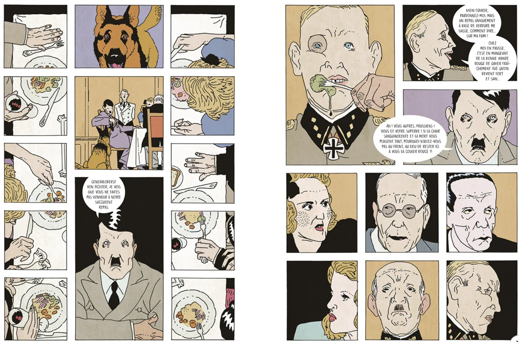 Nous sommes dans une atmosphère de fin de règne et le délire nazi ne peut s’achever que dans la déliquescence et la folie. Le corps malade affaibli du dictateur, soigné par les drogues se conjugue avec ses hallucinations, qui se multiplient. Le dessin de Marco Galli, auteur de BD et peintre italien, est essentiel pour raconter ces moments hors du temps et disent mieux que les mots la folie collective qui devant la défaite proche, se révèle enfin aux yeux des plus lucides.