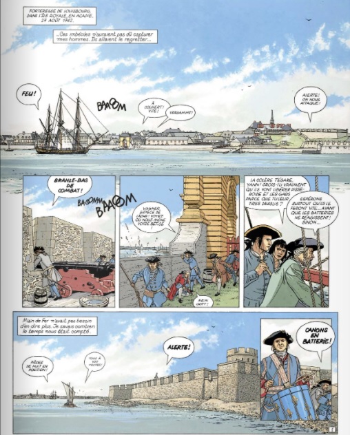 À la justesse des dialogues se combine l’exactitude des dessins qui vous emmènent tout en haut des mâts, au sommet de la vague ou dans les riches décors de Versailles, quand le doré omniprésent des tentures éclabousse la page. Tout est juste et tout est beau.