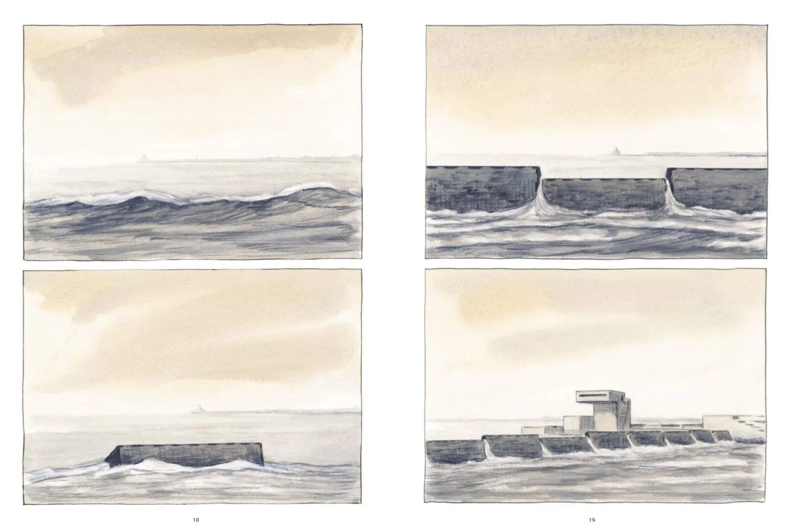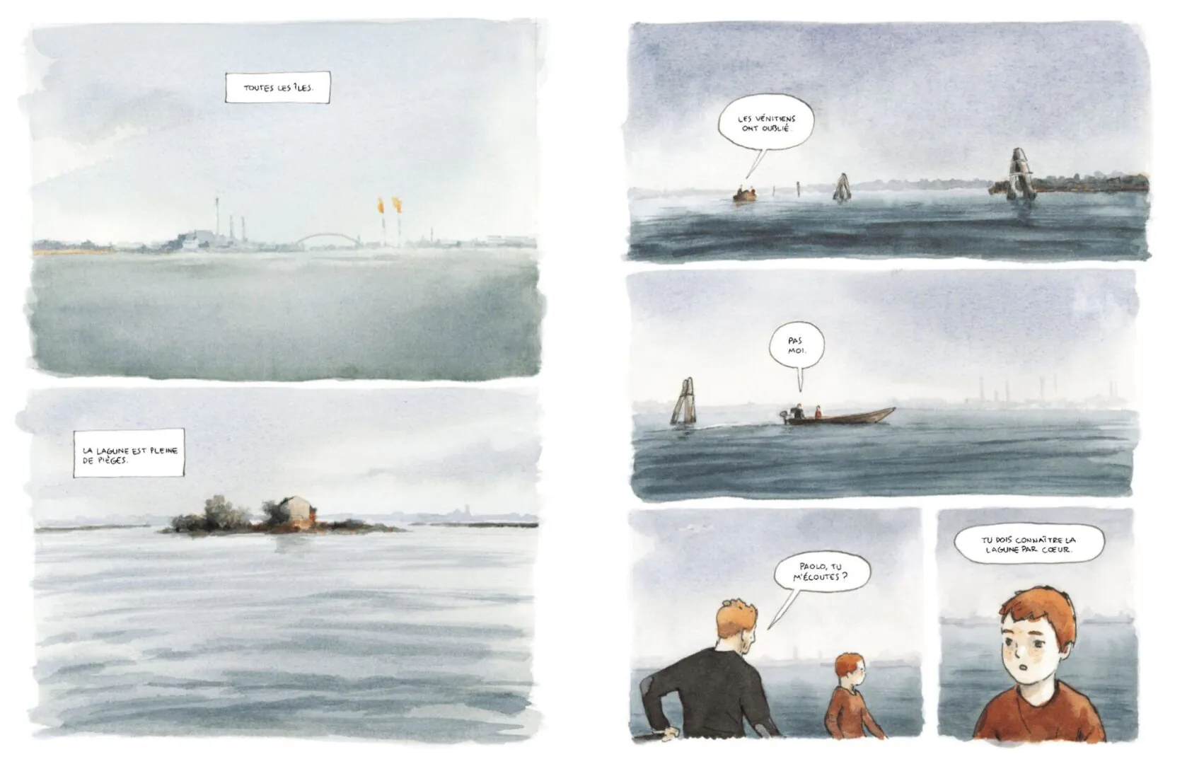 Paolo a seize ans. Il vit sur l’Île de la Giudecca, près de Venise. « La lagune est pleine de pièges » lui déclare son père alors qu’il n’est encore qu’un enfant, dans une barque. C’est un peu la découverte et l’histoire de ces pièges à venir que nous raconte le scénario de Christophe Dabitch. Venise est loin, une ombre, une silhouette lointaine dans la brume hivernale. Un lieu de théâtre et de représentation où les autochtones n’ont rien à faire. Vous ne verrez donc pas la moindre pierre du Palais des Doges. Juste, à peine esquissée, la Tour de la place Saint-Marc, au bout du bout de l’horizon. C’est la lagune où se déroule la vraie vie, cette mer intérieure qui se cache, loin des regards des touristes agglutinés sur les ponts des paquebots, c’est elle qui nous est offerte par des aquarelles magnifiques de Piero Macola. Muettes, elles nous invitent à rentrer dans le livre, tel un carnet de voyages fait d’impressions et de sensations. Nous sommes conviés à une promenade dans les marais, sur les grèves sableuses peu fréquentées, au lever du jour hivernal quand les canards s’envolent dans la brume ou à la tombée de la nuit quand se dissimulent les trafics en tous genres. Images minimalistes, images à la limite de l’abstraction, images légères ou porteuses de peur, nous côtoyons un univers peu connu, protégé du monde et propice aux mystères et aux magouilles. Un univers clos à quelques encablures de la foule.