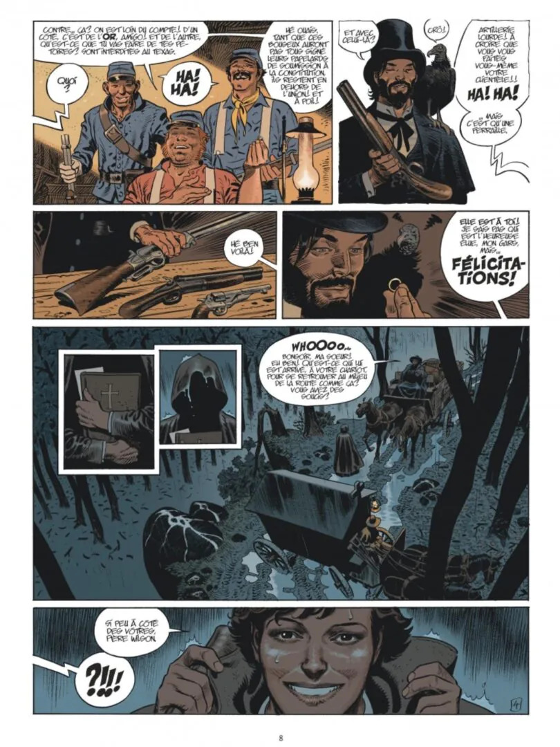 Nous sommes au Texas, dans la petite ville d’Eaden City. La communauté est violemment divisée car le médecin local doit pratiquer, à la demande d’une mère désespérée, un avortement. Une ligue pour la suppression du vice souhaite empêcher par tout moyen, y compris la violence extrême, l’acte médical. À la tête du mouvement religieux, que l’on pourrait qualifier de « pro-life », une jeune femme, Sister Oz, rameute les foules avec des prêches hallucinatoires. Si vous pensez que nous sommes dans l’Amérique de Trump, vous faites erreur car lorsque Sister Oz s’agite frénétiquement, l’avortement au Texas est légal et en aucune manière un sujet de société. C’est l’agitatrice qui, lors de l’histoire que raconte Xavier Dorison, est seule hors la loi. Nous sommes donc en réalité à la fin de la guerre de Sécession et c’est fort heureux car nous retrouvons notre croque-mort préféré, Jonas Crow, dans ce magnifique septième album « Master Prairie ».