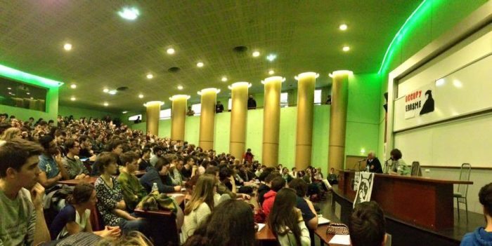 L’amphithéâtre était plein à craquer, l’ambiance électrique. Nous sommes à la veille de la manifestation du jeudi 28 avril contre le projet de loi El Khomri. Dans la salle, certains préparent au posca leur affiche. Difficile de savoir qui est le plus attendu de Bernard Friot ou Usul. Le porte-parole du mouvement Germinal le reconnaît, le deuxième a permis de faire connaître le premier grâce à sa série sur YouTube. « Mes chers contemporains » met en lumière une personnalité politique, médiatique ou intellectuelle de notre époque sur un format de 30 minutes environ. Après BHL, Étienne Chouard, Frédéric Lordon, Élisabeth Lévy, Usul avait choisi de consacrer son épisode à Bernard Friot et au concept de salaire à vie. Le youtubeur a réussi le pari d’allier une infographie claire, un humour hérité de sa chronique « 3615 Usul » et une connaissance large des enjeux contemporains. Lors de la conférence, Usul représentait également le mouvement « On vaut mieux que ça », un « collectif de citoyens et citoyennes créatifs, initié dans le but de libérer la parole sur des problèmes de société, tel que le travail ».
