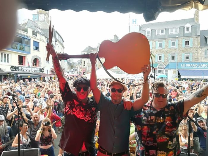 Enfin le dimanche 28 juillet, le groupe rennais Hudson Maker donna à la scène Cloche ce qui fut sans doute l’une des performances les plus ébouriffantes de cette dernière journée du festival. Il fut créé en 2013 par le contrebassiste Tof (habitué du festival binicais et officiant également pour Sleeper Bill & Mr. Tof), le guitariste et chanteur Alban, ainsi que le batteur Francky. À travers leurs deux albums sortis en 2014 et 2018, le groupe s’est mis un point d’honneur à interpréter leurs compositions dans le style du rockabilly des années 50. Lunettes noires calées devant les yeux, à la manière des Blues Brothers, ils ont immédiatement attaqué leur concert par « Me I Like », l’un des morceaux de leur premier opus « Crazy Train » sorti en 2014 sur le label Beast Records.
