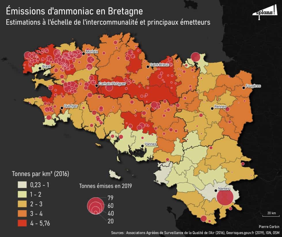 On le sait, l’industrie agro-alimentaire est un sujet qui fâche en Bretagne, et l’on ne compte plus les intimidations et menaces plus ou moins voilées que subissent les journalistes qui tentent d’enquêter sur le sujet. Pourtant, les conséquences du modèle agricole productiviste sur la santé et l’environnement ne peuvent plus être ignorées. C’est dans ce contexte tendu et en pleine séquence électorale que Splann !, « la première ONG entièrement dédiée à l’investigation journalistique en Bretagne », a publié, lundi 14 juin, sa première enquête en trois volets, consacrée au problème de l’ammoniac en Bretagne. Travaillant notamment à partir de données publiques (rapports, études, cartes…), les auteurs tentent de faire la lumière sur les conséquences environnementales et sanitaires de ce gaz dont les émissions sont responsables d’une grave pollution de l’air et entraînent problèmes respiratoires, maladies cardio-vasculaires et cancers chez ceux qui y sont exposés, sans que cela n’émeuve les industriels ni les collectivités publiques. L’enquête propose une carte interactive permettant de visualiser les émetteurs d’ammoniac dans la région.