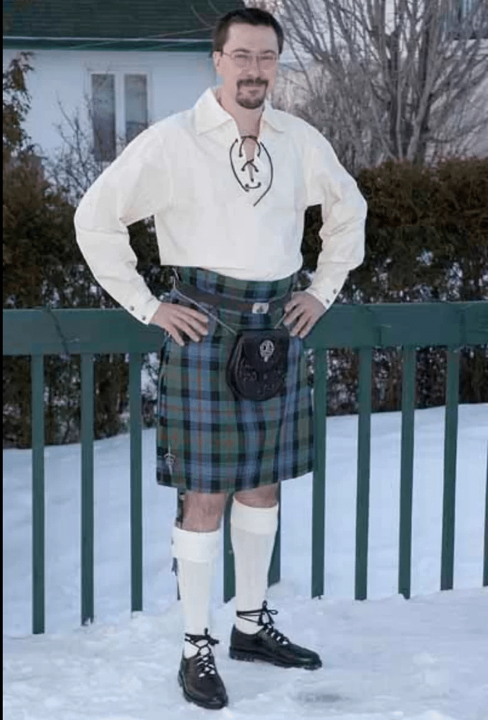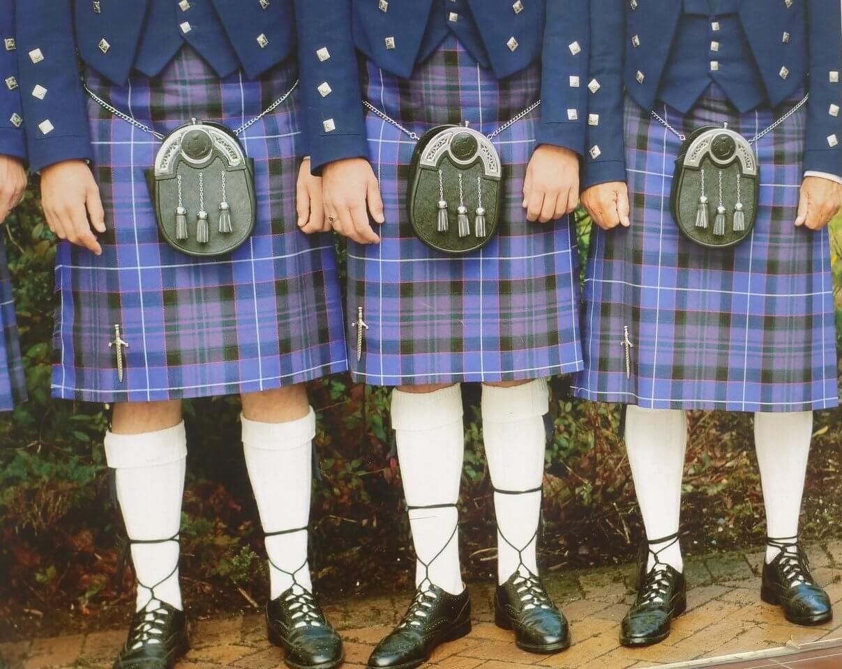 Le Kilt, vêtement de guerrier à l’origine, est composé d’une pièce de laine à carreaux faite de lignes horizontales et verticales entrecroisées de multiples couleurs, appelé tartan. Son motif est unique et représente à chaque fois un clan. La tenue est composée de dix accessoires et il faut compter quinze à vingt minutes pour l’enfiler : la chemise Ghillie est une chemise traditionnelle avec un laçage en cuir croisé sur le devant ; le Kilt Hose, ce sont des chaussettes en laine repliées sous le genou et portées avec des fixe-chaussettes ; le Sporran est une sorte de pochette qui pend autour de la taille à partir d’une chaîne ou d’une lanière de cuir ; le Ghillie Brogues sont des chaussures sans languette avec de longs lacets qui s’enroulent autour de la jambe au-dessus de la cheville et s’attachent sous le mollet ; la ceinture est le plus souvent en cuir avec une boucle en relief ; le Kilt Pin est porté sur le coin inférieur du tablier extérieur du kilt : il empêche le tablier de s’ouvrir en lui ajoutant un poids supplémentaire. Il est aussi décoratif et parfois il est le symbole d’un clan ; le Sgian-dubh est le petit couteau noir porté dans la chaussette ; la veste Prince Charlie est la veste généralement réservée aux occasions plus formelles.