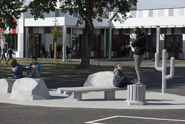 Devant l’école maternelle Jules Ferry, dans le quartier de Patton, une petite fille court entre des souches d’arbres légèrement colorées, récemment installées. Au milieu de cette forêt de sculptures, cinq jeunes arbres fruitiers, des pommiers, donnent leurs premières feuilles. L’enfant slalome entre les objets de béton, semblables à des vestiges du passé, avant de monter sur l’un d’entre eux.