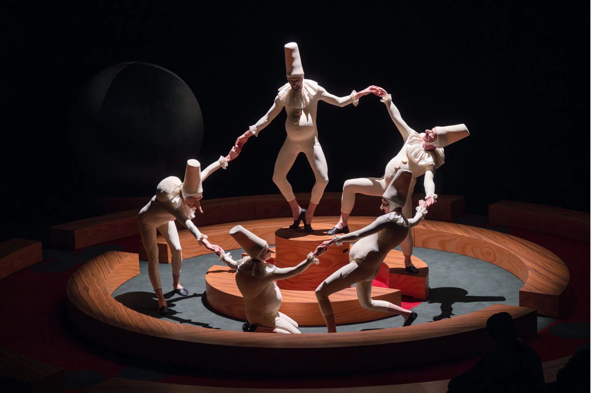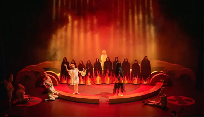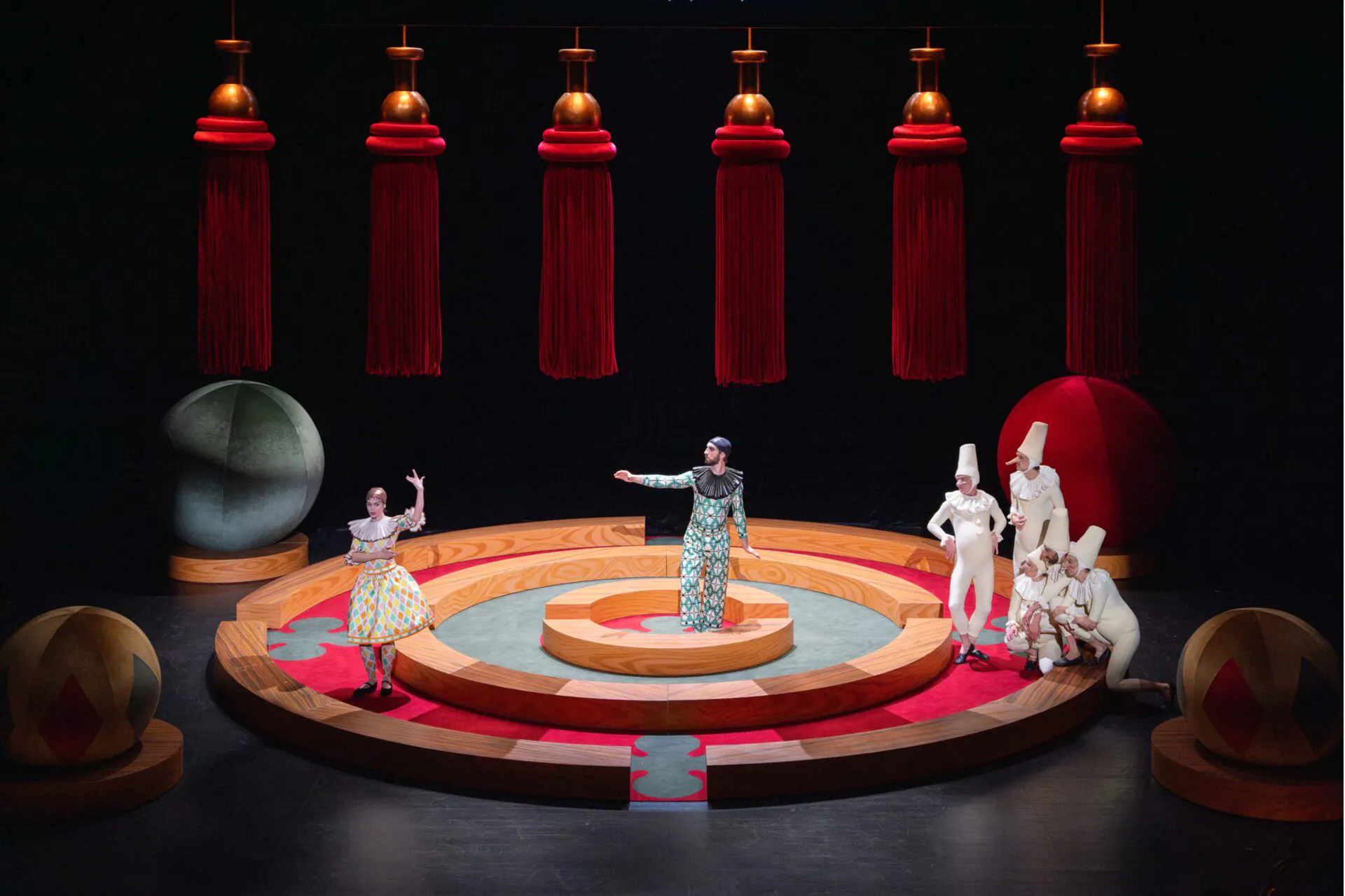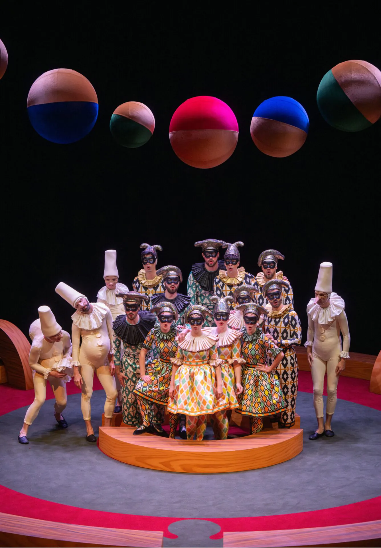 L’intrigue en est mince et l’argument, même s’il s’en inspire, n’atteint jamais vraiment au Cornélien.Pourtant, servi par une musique rafraîchissante, passant avec facilité du sérieux au comique, il entraînera le public dans une histoire amusante portée par une mise en scène très créative. En résumé, Léonore et Isabelle sont toutes deux amoureuses de Léandre, celui-ci donne sa préférence à la seconde provoquant l’ire de la première comme la jalousie de Rodolphe qui lui, aime Isabelle. Les amants malheureux décident de tuer l’inconstant mais, par chance, se trompent de cible et Léandre réapparaît, fringant, décidé à fuir sous d’autres cieux avec celle qu’il aime. Ces événements se déroulent sur fond de carnaval et permettront aux deux metteurs en scène et plasticiens,Yvan Clédat et Coco Petipierre, de se livrer à un festival de couleur et de formes tout à fait enchanteur.Sur la scène une sorte cercle aux éléments modulaires, rappelle par instant la ville de Venise et à d’autres moments la piste d’un cirque où évoluent des artistes en répétition. De curieux personnages en forme de polichinelles blafards, disgracieux et bossus, évoluent à leur gré comme des observateurs pas tout à fait indifférents.Ils semblent être comme une huile qui permet à l’œuvre de se dérouler sans accrocs et à l’intrigue de se transporter d’une ambiance à l’autre. La dimension comique, peu évidente au début prend peu à peu sa place et nous transporte même dans une autre œuvre bien connue «Orphée et Eurydice» sous forme d’un pastiche. D’énormes boules de couleur se promènent sur scène comme des jouets ou même descendent des cintres comme des planètes. Petit coup d’œil à l’ambiance Vénitienne, cinq glands de passementerie de grande taille viennent animer le décor et servent de cachette à l’un des protagonistes. Si la musique est bien servie, le chant et la danse sont aussi célébrés. Les cinq solistes accompagnés par les membres du chœur du studio IL CARAVAGIO soutiennent avec énergie une partition clairement teintée de joie de vivre à l’Italienne. Anas Séguin plante un acceptable Léandre, Anna Reinhold et Victoire Brunet, en Léonore et Isabelle, se répondent avec talent, Apolline Rai-Westphal étincelante dans son costume de minerve manque un peu de puissance mais a une belle présence scénique, Clarisse Dalles est vraiment une bonne fortune, toutefois notre préférence, pour cet opéra, ira à Guilhem Worms solide dans tous ses rôles et même jubilatoire en Pluton. C’est d’ailleurs l’occasion d’évoquer les costumes, fabriqués dans les ateliers de l’opéra de Rennes et qui sont une remarquable réussite. La danse des démons autour de Pluton les met en valeur et la démarche de ces diables à la manière des danseuses populaires Russes est une vraie trouvaille. Dommage que, passés les premiers moments cela ne devienne un peu trop brouillon. Cette fois encore Guilhem Worms s’y montre exemplaire, malgré l’épaisseur de ses semelles de10 à 12 centimètres peu opportunes pour un ballet.