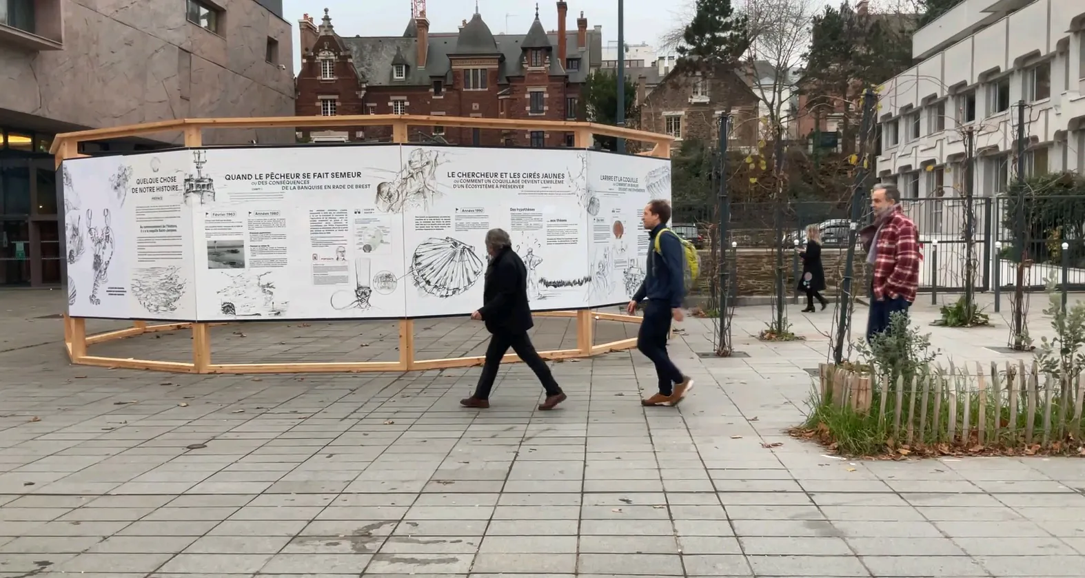 L’exposition débute à l’extérieur, dès l’arrivée sur le parvis des Champs Libres. Une grande fresque, réalisée par l’illustratrice et artiste-plasticienne Lise Hascoët avec l’aide de scientifiques ayant pris part au projet, se dresse sur une structure de bois et appelle le passant. Elle retrace une dizaine d’années de recherches, de l’intérêt porté à la coquille Saint-Jacques jusqu’aux missions dans différentes zones du monde en passant par les découvertes extraordinaires autour de ce fascinant mollusque.