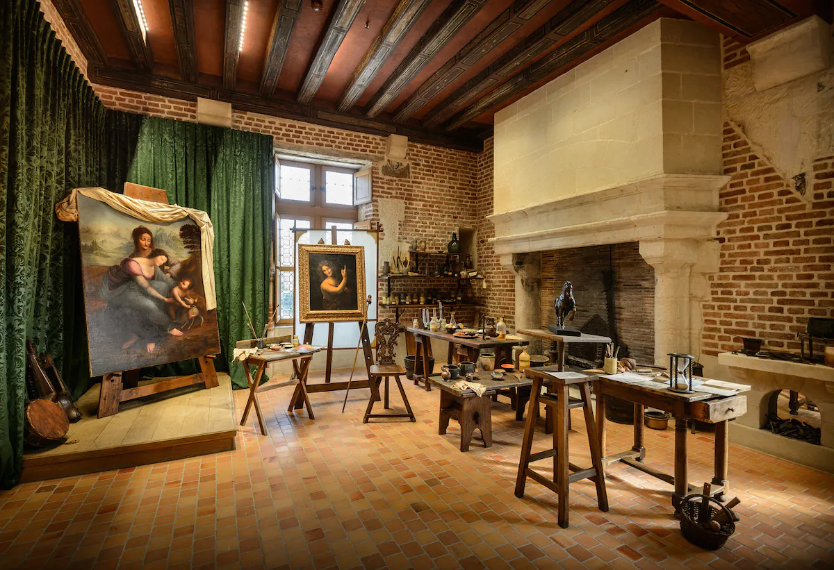 Dans les ateliers de Léonard, le visiteur est plongé dans un scénario immersif. Il assiste à la rencontre historique entre le Cardinal d’Aragon et le maître qui présente ses trois chefs-d’œuvre : la Joconde, le Saint Jean-Baptiste, la Sainte Anne. Une production audiovisuelle utilisant la technologie ghost ou « théâtre optique » est projetée. Le visiteur devient ainsi le spectateur de cette rencontre exceptionnelle, comme si Léonard de Vinci était présent.