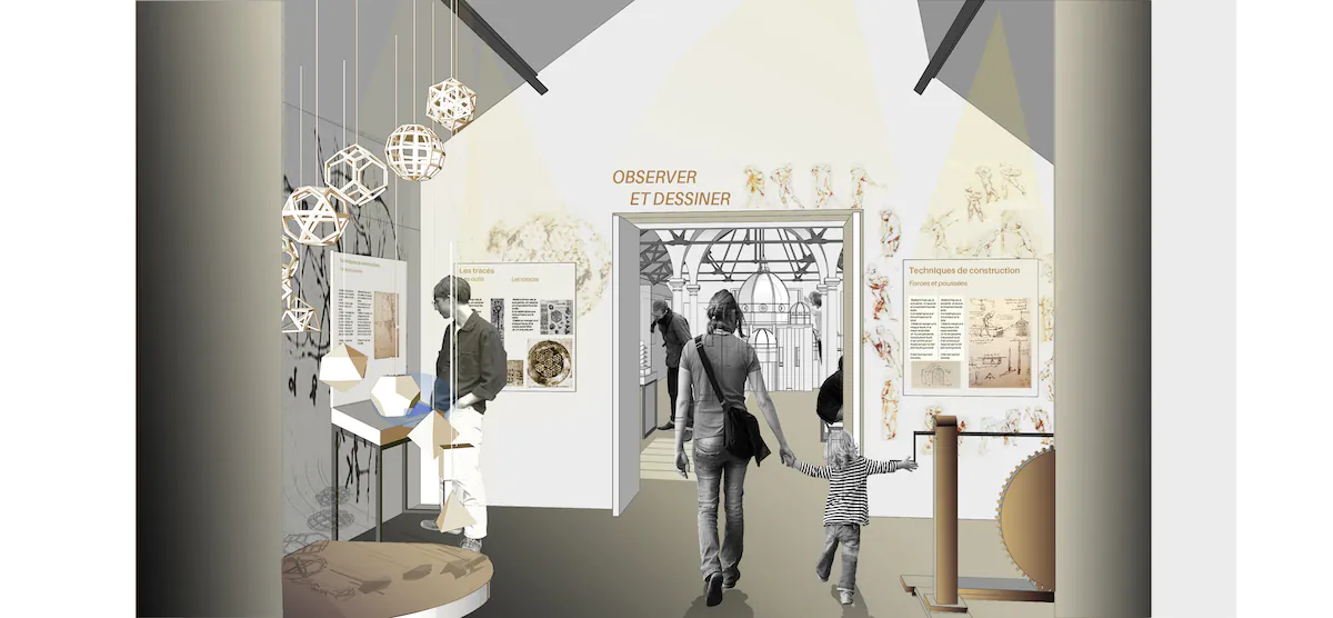 Dans la galerie supérieure, un parcours pédagogique et ludique permet de mieux appréhender tout l’univers de Léonard de Vinci architecte civil, religieux et militaire, urbaniste et metteur en scène de spectacles éphémères. Cette galerie met en lumière sa passion pour les mathématiques et la géométrie dans l’espace. Des maquettes grandeur nature, des tables digitales, des animations 3D, des jeux vidéo jalonnent le parcours.
