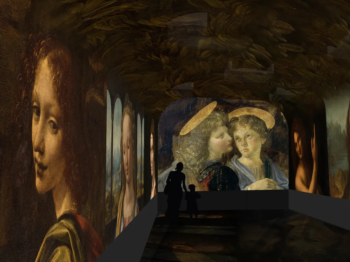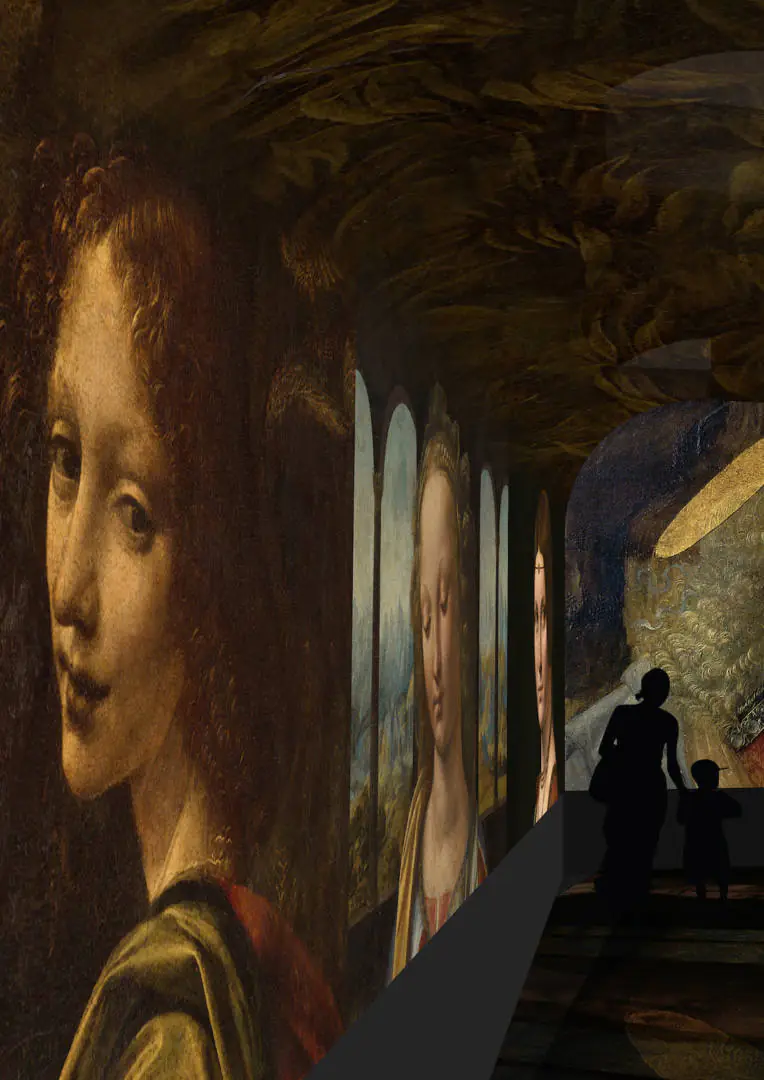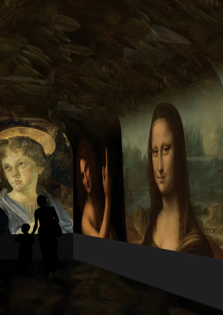 La réunion en une seule galerie des trésors du Louvre, de la Galerie des Offices de Florence, des musées du Vatican, de la National Gallery de Londres, de la Pinacothèque de Munich, du Musée National de Cracovie, de l’Ermitage de Saint-Pétersbourg, de la National Gallery de Washington, constitue une nouvelle approche et une plongée inédite dans l’œuvre peint de Léonard de Vinci. Placé au centre du dispositif de projection, le visiteur est invité à un voyage immersif pour contempler le legs pictural et esthétique de l’artiste. Les correspondances des visages, des sourires et des mains, la perspective, le sfumato, la Cène et les horizons bleutés des paysages de ses tableaux se mêlent dans une ronde poétique et fascinante.