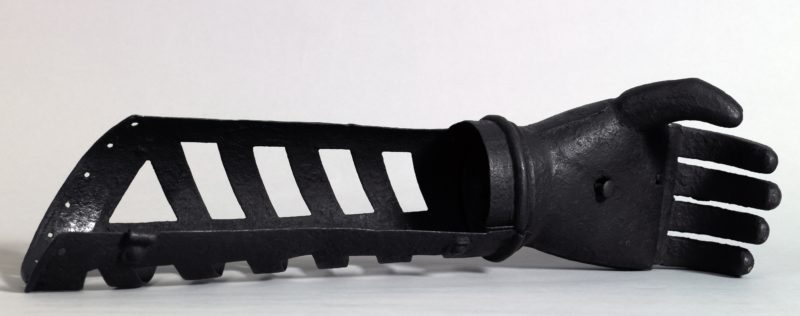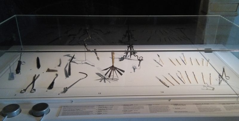Ces avancées sur la connaissance du corps humain ouvrent la voie à la chirurgie. Un exemplaire des œuvres complètes d’Ambroise Paré, considéré comme le père de la chirurgie moderne, est d’ailleurs exposé. Bien qu’étant parfois décorés avec soin, les instruments tels que les cautères, les pélicans dentaires ou le nécessaire du chirurgien inspirent une certaine crainte. Mélange des époques, pour notre plus grande surprise, puisqu’une prothèse de main et d’avant-bras du 16e siècle côtoie La jambe rose de Sarah Tritz.
