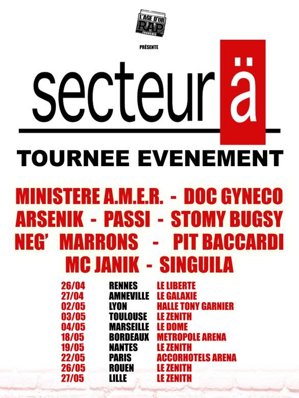 Malgré leur séparation brutale, les membres du crew sont restés en contact et reviennent plus soudés que jamais. Que les fans se rassurent, ils n’ont presque pas changé, les voix sont identiques, et les chansons n’ont pas pris une seule ride. Les artistes du Secteur Ä ne se sont produits sur scène qu’à deux reprises, lors de deux soirées mythiques à l’Olympia, les 22 et 23 mai 1998. Un souvenir mémorable et symbolique pour le collectif qui rendait hommage au 150e anniversaire de l’abolition de l’esclavage. Jeudi, Secteur Ä se déplace à Rennes au Liberté pour un show de 2h30, avec « des surprises, des courts-métrages, des petits films, et 40 morceaux à placer dans le show », atteste Stomy Bugsy. À dix sur scène, ils remettront au goût du jour quelques tubes qui ont joué en leur notoriété comme Né ici de Doc Gynéco, Je zappe et je mate de Passi, Mon papa à moi est un gangster de Stomy Bugsy, ou encore Le Bilan des Neg’Marrons. Le 22 mai 2018, soit vingt ans après jour pour jour, le collectif se produira non pas à L’Olympia mais à l’AccorHotels Arena à Paris. En attendant, une compilation de trois albums de Secteur Ä sortira le 2 mai prochain pour accompagner cette tournée des Zénith.