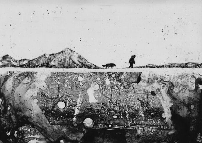 Peut être parce que L’amour de la vie est un peu plus optimiste quelques couleurs apparaissent sur ses illustrations. Pas de rouge flamboyant, de vert tonitruant mais des couleurs automnales et un peu de rose, tel le sang collé à quelques os de cadavres. Les paysages deviennent parfois plus abstraits, les reflets sur l’eau glacée se mélangent, se transforment en taches informes. Comme l’homme qui a faim on cherche à distinguer les traces de la réalité et celles de l’hallucination. Les repères de la terre et du ciel disparaissent. On guette chaque parcelle des images pour tenter d’y trouver une pierre, un poisson. On pense parfois les avoir trouvés. Mais peut être pas. L’imaginaire fait le reste.