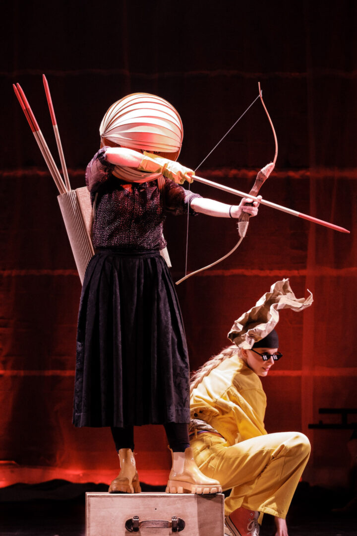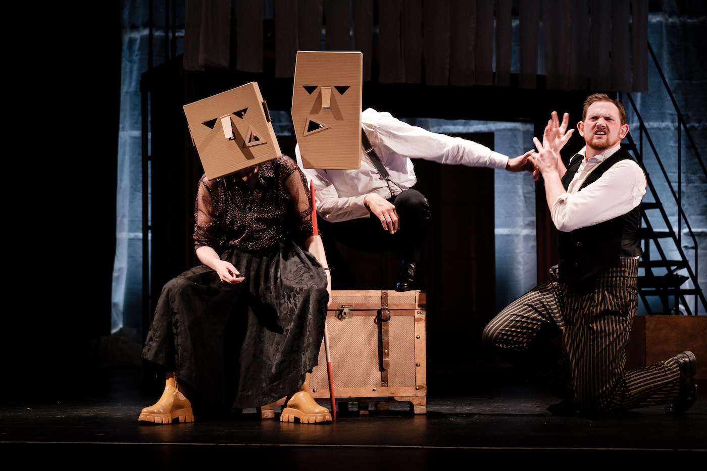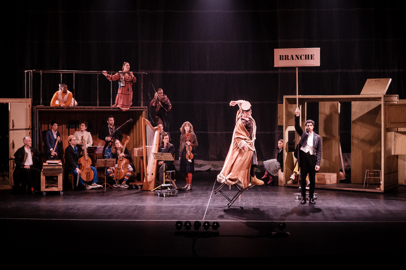 De ce point de vue, nous avons été à la fête. Conçus par Oria Puppo, les costumes de l’orchestre comme des acteurs, bariolés et joyeux, donnent le ton de la bonne humeur et, de fait, c’est elle qui prévaudra toute la durée du spectacle. Celui-ci est mené de main de maître par deux comédiens à la très belle présence, Fiamma Bennet, en suicidaire désopilante, débarquant avec la corde au cou sur scène, après avoir traversé le public réjoui de cette arrivée inopinée, mais aussi du remarquable Soufiane Guerraoui, en monsieur loyal polyglotte, aussi à l’aise dans le chant que dans la danse et époustouflant de présence scénique.