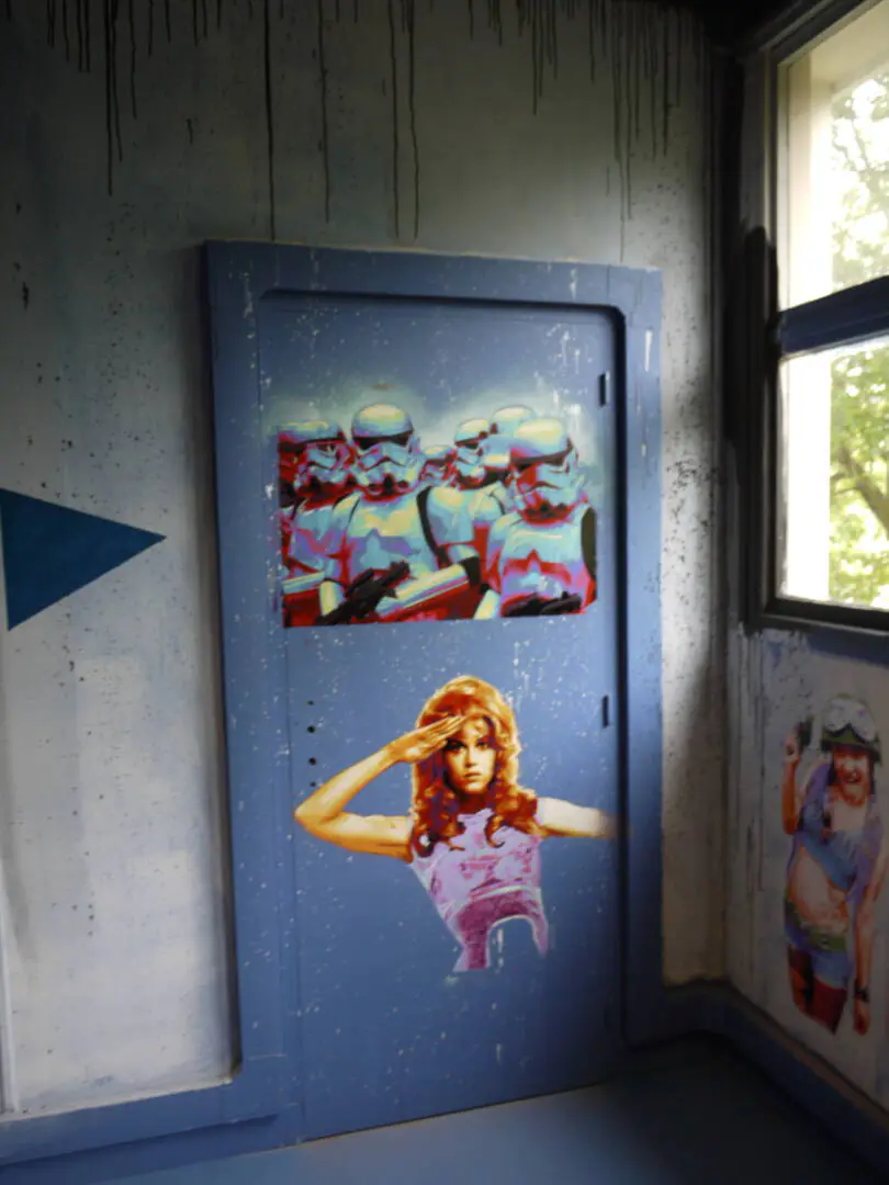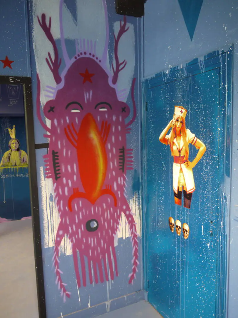 Pensées comme une œuvre d’art, les deux pièces se révèlent le miroir de leurs psychés. Leurs pratiques et techniques – spray et acrylique pour Tarek, pochoir pour Mat – se mélangent jusqu’à former une unité picturale. « J’avais déjà une idée de la mise en scène. Comme je fais de la bande dessinée, j’aime raconter des histoires. » Ainsi, des inscriptions blanches apparaissent sur les murs bleutés et côtoient les références aux univers qui influencent les deux artistes, dadaïsme et surréalisme en tête. L’écho à l’œuvre de Marcel Duchamp résonne avec les portraits de Charles Baudelaire ou d’un chef amérindien, et l’armée de stormstroopers, pochés par Mat.