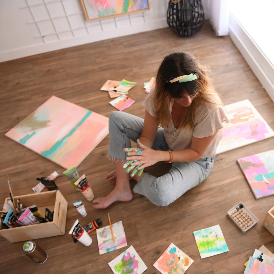 La philosophie d’Emeline est de penser que la créativité est en chacun de nous, que l’on est tous créatifs, qu’il faut libérer sa créativité, révéler sa singularité artistique, oser son âme d’artiste et enfin s’autoriser à faire le premier pas vers sa créativité. C’est donc en 2019 qu’elle ose se définir comme une artiste et installer son atelier désigné : l’Atelier Libratoi à Saint-Quay-Portrieux (22). Elle consacre alors sa vie pleinement à la peinture, à l’abstrait, à l’art thérapie et à des ateliers créatifs pendant 3 années. En 2022, elle reprend une activité annexe et travaille en parallèle dans le marketing. Elle installe alors son atelier de peinture à son domicile à Binic-Etables-sur-Mer. Sa peinture est consacrée uniquement à l’acrylique “Souvent, je la dilue avec des éléments naturels du bord de mer : du sable, des éponges de mer, des coquillages, etc.” Emeline aime s’installer en bord de mer pour peindre. “C’est mon art de vivre ! Les paysages inspirent mes émotions”. Il lui arrive aussi d’ajouter des feuilles d’or ou d’argent pour donner du relief à ses tableaux abstraits. Elle expose aujourd’hui, pour la première fois, une vingtaine de ses 60 œuvres réalisées au total.