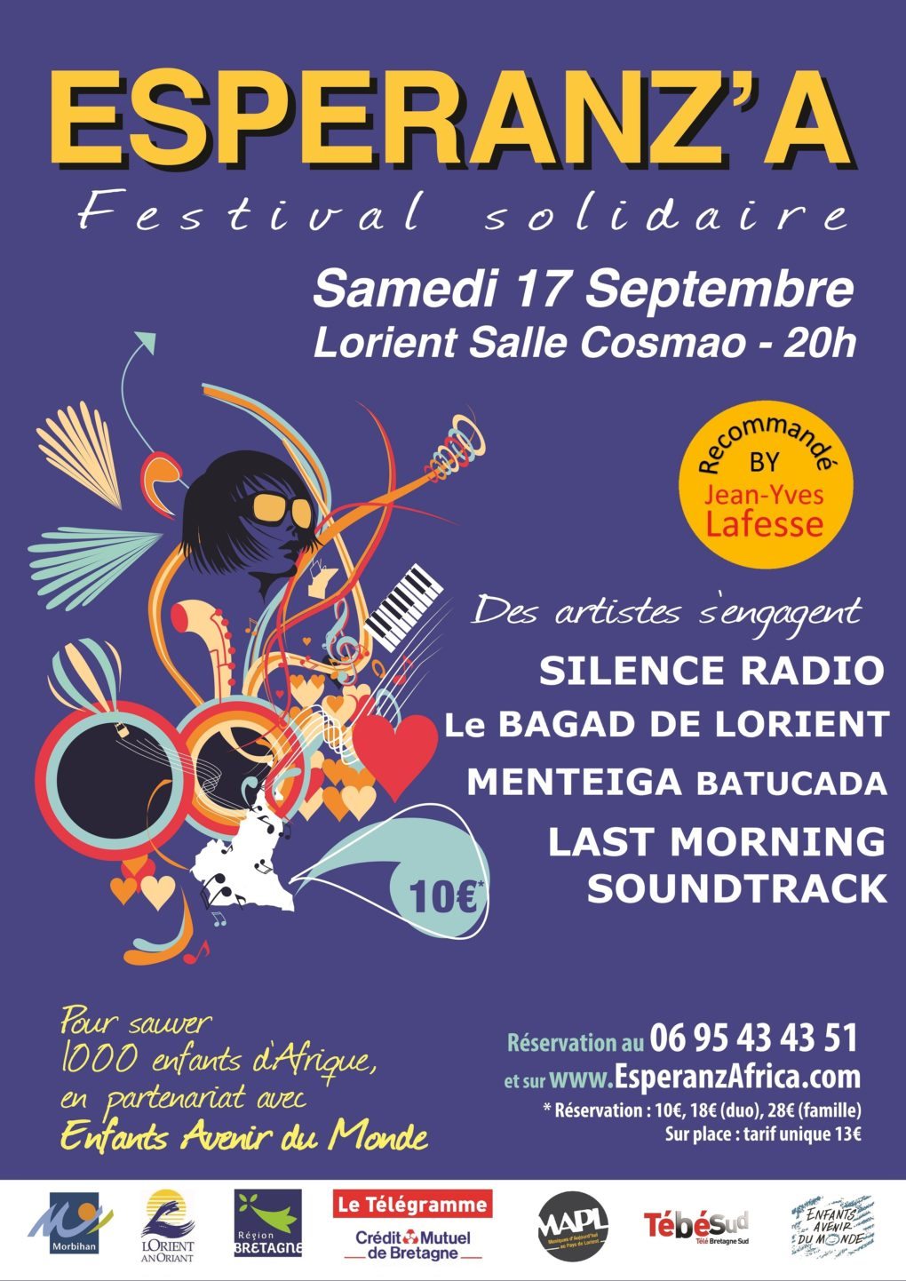 Samedi 17 septembre 2016, salle Cosmao à Lorient, des artistes mobilisés avec les organisateurs du festival Esperanz’A vous invitent à apporter votre contribution citoyenne, à franchir le cap du geste solidaire simple, mais utile. Face à l’urgence, le choix d’Espéranz’A est clair : nous pouvons agir, ici, et nous le faisons, parce que d’autres ailleurs risquent leur vie sur le terrain pour faire savoir l’horreur terroriste dans le quotidien de populations qui ne font pas la une des journaux.