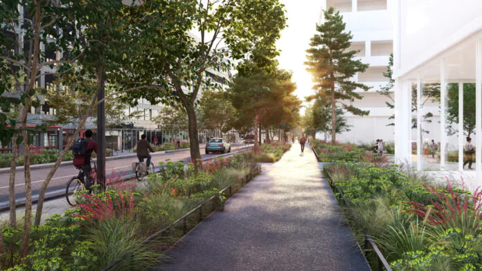 Les trottoirs seront élargis, généreusement végétalisés et feront place à des parcelles desimperméabilisées et végétalisées. Une centaine d’arbres seront plantés sur les deux rives tout le long de l’axe. Quecrus phellos, Pinus sylvestris, Prunus avium « Plena » et prunus subhirtella côtoieront les noisetiers de Byzance existants. Des pistes cyclables dédiées, séparées de la route par une bordure en béton chanfreinée, sécuriseront les déplacements doux, à proximité d’une voie où la circulation automobile sera limitée à 30km/h.