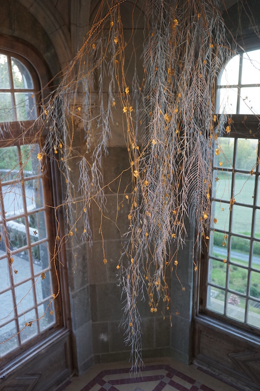 Installée dans une tourelle, Ada est un clin d’oeil discret à l’histoire du lieu. Stigmates des convulsions de l’histoire, le château subi de lourdes destructions lors des bombardements en 1944 de la Royal Air Force. La nature s’est par la suite immiscée dans les failles du temps et de la pierre à l’image des feuilles de laiton et de cuivre ainsi que des lianes de polyuréthane d’Eva Jospin. Aérienne, l’oeuvre se déploie tel un lustre faussement végétal. Poétique aussi comme l’est le motif des ruines cher au peintre Hubert Robert (1733-1808). Celui que l’on surnommait alors « Robert des ruines » imaginait volontiers la Grande Galerie du Louvre à ciel ouvert, nourri très certainement de ses souvenirs des vestiges antiques observés et croqués lors de sa visite à Pompéi.