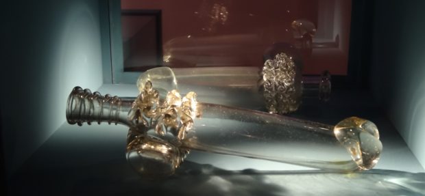 Au XVIIIe, se multiplient les créations qui oeuvrent en faveur d’une égalité du désir et de sa représentation. Se découvrent alors des objets crus (bouteilles en verre soufflé en forme de phallus), insolites (amulettes en forme de phallus sensées protéger de la fascination du corps féminin) ainsi que des œuvres plus sobres flirtant avec l’érotisme et les codes de l’époque (éventails aux motifs de scènes d’amour cachant d’autres scènes plus évocatrices). Aux pièces de Robien s’ajoutent des celles de collections privées et les autres issues des musées de Cluny, du Louvre, de Guimet et des Arts Décoratifs (dont trois jeux d’estampes vont se succéder tous les trois mois).