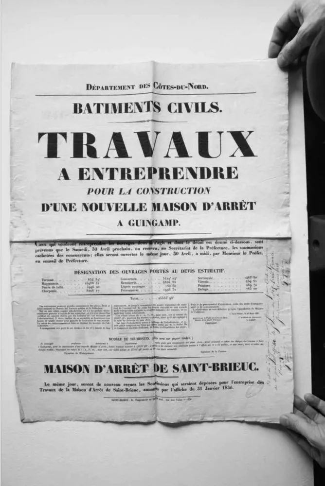 Pour l’exposition que je prépare, les visiteurs pourront circuler dans cette sorte de coursive extérieure définie par l’espace entre les murs de l’ancienne cour de promenade et ceux de la salle d’exposition, pour consulter des documents d’archives sur l’histoire de la prison de Guingamp disposés derrière les vitres utilisées à revers comme de grandes vitrines verticales. La construction de la prison de Guingamp – une des premières prisons cellulaires en France, y apparaît comme un tournant dans l’histoire de l’architecture carcérale : c’est le moment où s’installe l’idée qu’il faut séparer les prisonniers pour éviter la contagion du crime, limiter la vie sociale, catégoriser les prisonniers, toutes choses qui perdurent dans notre système pénitentiaire actuel sans jamais être questionné, ou peut-être seulement une fois, avec le centre de détention de Mauzac, en 1984, conçu pour favoriser la vie sociale et l’autonomie des prisonniers. À Guingamp, je présenterai pour la première fois quelques images de cette prison expérimentale.