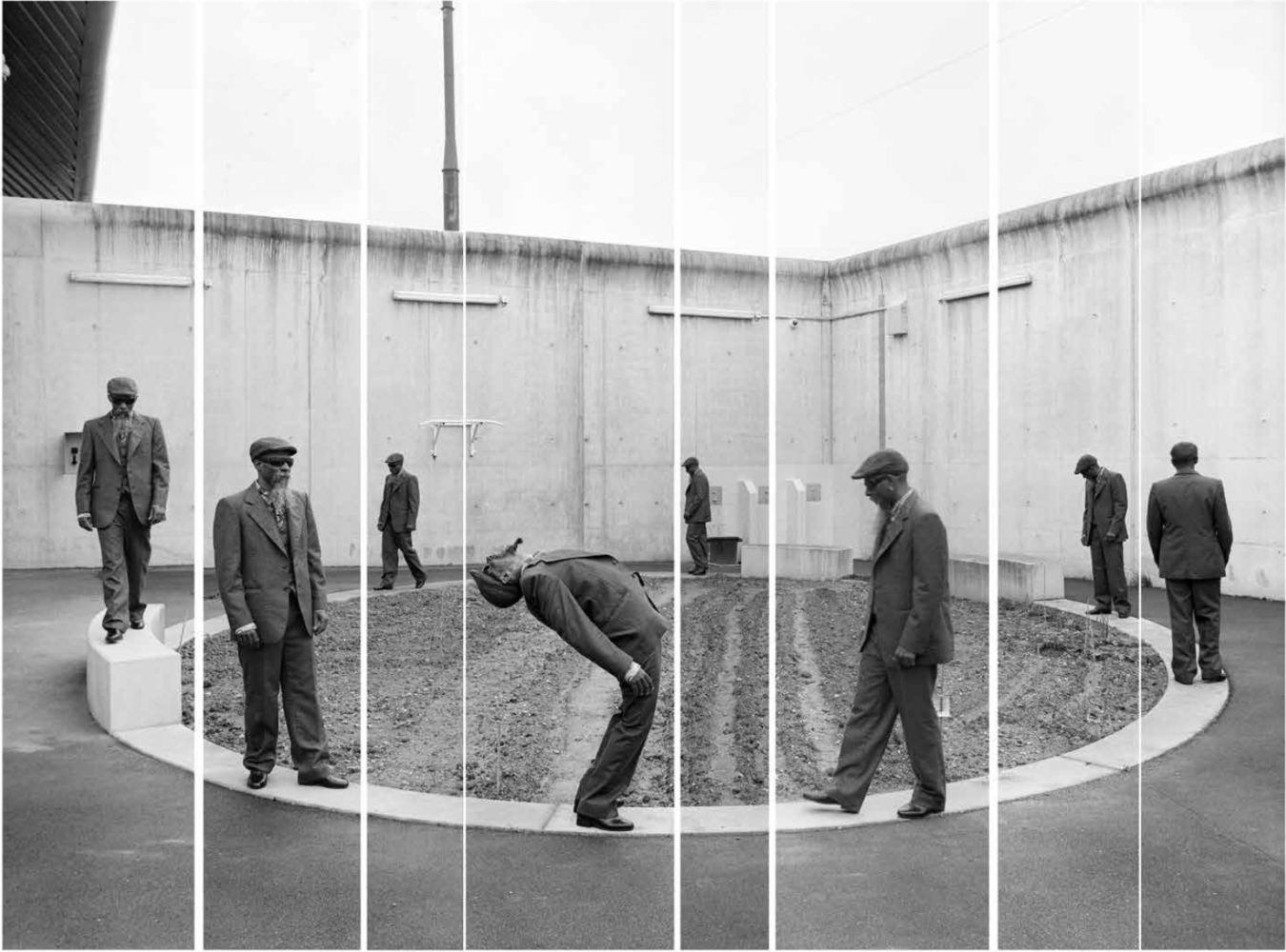 Trois photographies ont été réalisées avec un même prisonnier dans une cour de promenade de la maison centrale de Condé-sur-Sarthe. C’est la prison la plus sécuritaire de France, conçue pour accueillir les prisonniers qui posent problème. Julien insiste pour rejouer un dispositif que j’avais imaginé quelques semaines avant en collaboration avec Ange, un autre prisonnier.