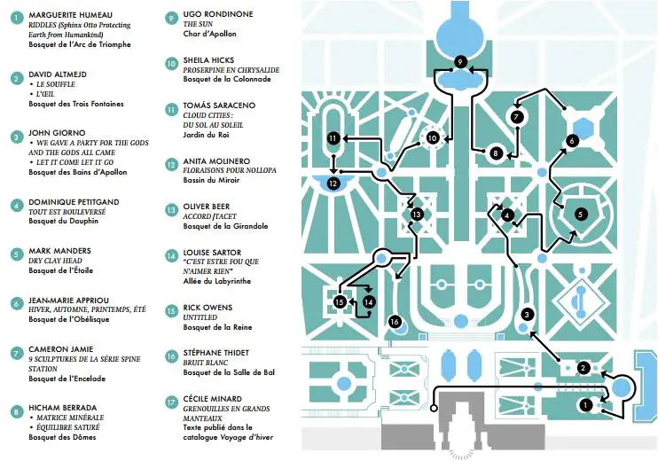 Exposition Voyage d’hiver, Château de Versailles, 21 octobre 2017 au 7 janvier 2018. Céline Minard, David Altmejd, Jean-Marie Appriou, Olivier Beer, Hicham Berrada, John Giorno, Sheila Hicks, Marguerite Humeau, Cameron Jamie, Mark Manders, Anita Molinero, Rick Owens, Dominique Petitgand, Ugo Rondinone, Tomás Saraceno, Louise Sartor, Stéphane Thidet.