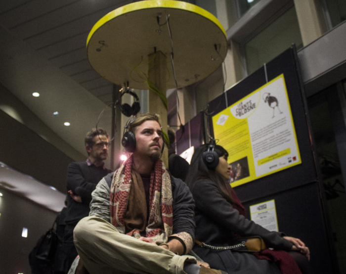 L’exposition est accompagnée de la « borne nomade » [photo ci-dessous] permettant l’écoute des portraits sonores. Conçue par le designer Edgar Flauw ce dispositif d’écoute est un élément mobile que l’association transporte dans ses différents lieux d’intervention – elle a déjà été placée au Carrefour 18, au Triangle, etc… Assis sur les sièges de la borne, le visiteur se munit du casque audio et se laisse bercer par les voix d’Alphonsine, Yassine, de Marie-Jo et des autres.