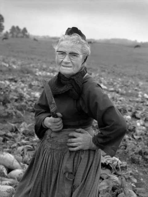 Les photographies de Thersiquel captent l’intimité de ce monde : une vieille femme au regard calme, assise à la fenêtre de sa cuisine ; un fermier en train de charger du foin ; un enfant tenant un agneau contre lui ; une procession sous la pluie ; une salle commune au mobilier rustique. À travers son objectif, chaque détail devient signifiant : la texture d’un mur, l’usure d’un tablier, l’expression muette d’un visage.
