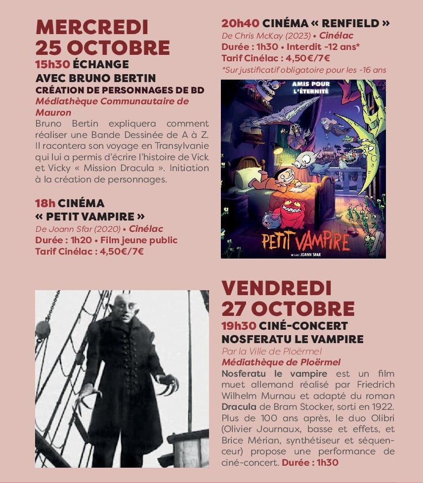 À 14 h – 15h et 16h30 : un échange et une création de personnages de bande dessinée avec l’auteur et dessinateur rennais Bruno Bertin : mission Dracula : Angelino est invité à découvrir la Roumanie et part en voyage avec ses amis. Arrivés en Transylvanie, ils se heurtent à la légende du comte Dracula – durée 45 minutes – sur inscriptions